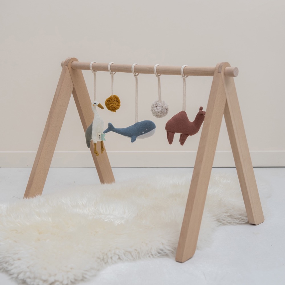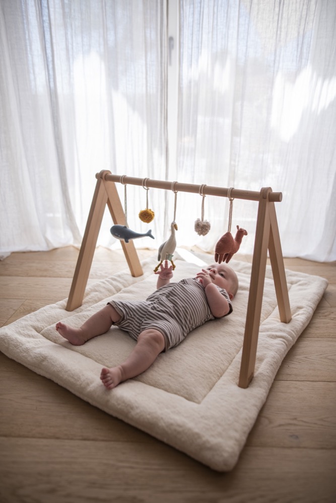 Deze prachtige speelboog van Trixie heeft 3 leuke dieren en 2 pluizige pompons. De pracht van deze boog ligt in zijn uitgepuurde vorm en eenvoudig ontwerp. Je kan de hangende elementen makkelijk verwijderen, of zelf iets anders toevoegen. In elk dier zit een belletje, zodat je kleintje elke keer aangenaam verrast wordt als zijn of haar handjes één van de dieren raakt. Dit is een zeer goede manier om hun hand-oogcoördinatie op een zeer speelse manier te verbeteren. De verschillende texturen van de gebreide dieren en de pompons geven baby's veel te ontdekken. Het genuanceerde kleurenpalet is afgestemd op de Bliss collecties, zodat ouders deze reeks prachtig kunnen combineren tot een harmonieus geheel. De prachtige kleuren worden ondersteund door rijke gebreide texturen en de pompons en vormen zo een mooie toevoeging aan je interieur. Baby's genieten van de verschillende texturen die ze met hun vingertjes kunnen ontdekken. De combinatie van al deze eigenschappen resulteert in een assortiment met een perfecte balans tussen de wensen van ouders en de behoeften van hun baby.