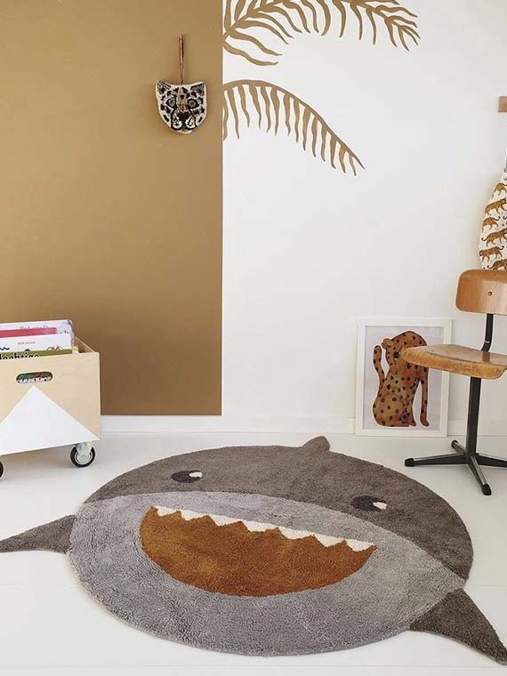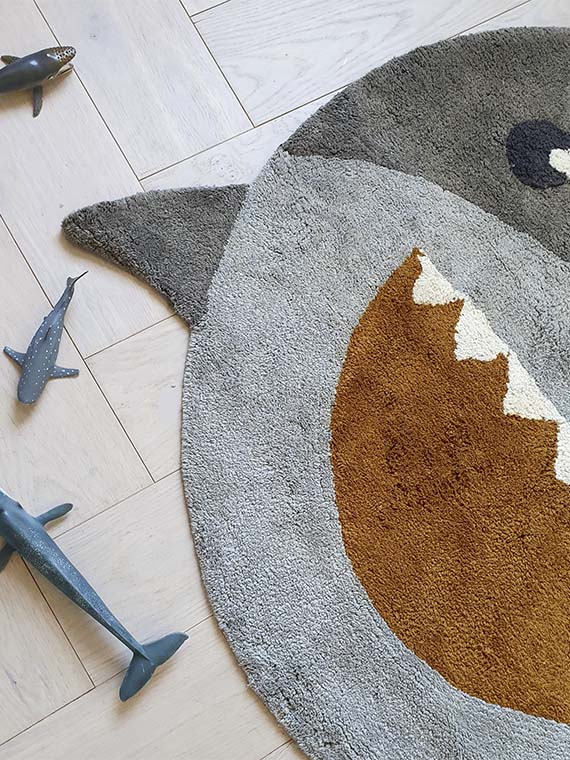 Het vloerkleed Shark van Tapis Petit is het perfecte vloerkleed voor jouw stoere jongenskamer of kamer met dieren thema. Deze haai heeft door de verschillende tinten grijs en bruin een gezellige en warme uitstraling. Het vloerkleed is handgemaakt van getuft katoen en daardoor heerlijk zacht aan je voeten.