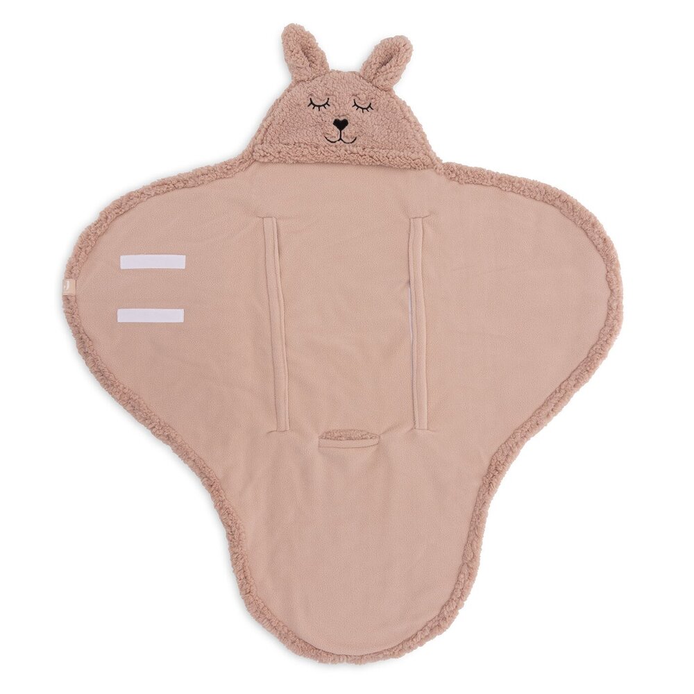Wikkeldeken met gegarandeerd mega hoge cutenessfactor. De stof is van fluffly vachtlook aan de buitenkant en heerlijk comfortabel zacht aan de binnenkant. Wikkel je baby in deze omslagdoek en sluit de deken met de praktische klittenbandstroken. Zet het mutsje erbij op en zie daar, die schattige oortjes en dito konijnengezichtje op het mutsje. Echt te lief! Deze omslagdoek is te gebruiken vanaf de geboorte. En ook heel handig te gebruiken in baby's eerste autostoel.