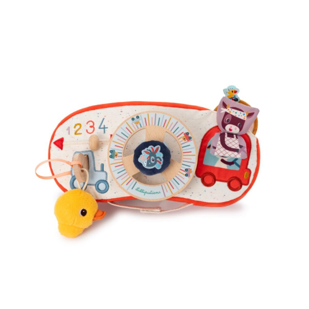 Het Lilliputiens Activiteitenpaneel boerderij auto is perfect voor kleine autoliefhebbers die de wereld van het autorijden willen ontdekken. De sleutel insteken, in de achteruitkijkspiegel kijken, in eerste versnelling schakelen... Net als een echte autobestuurder! Maar pas op dat je niet te snel gaat! Tut-tut! Opletten, want de vriendjes zijn ook onderweg: Paulette en haar kuikentjes, Rosalie en Yvon het schaap.