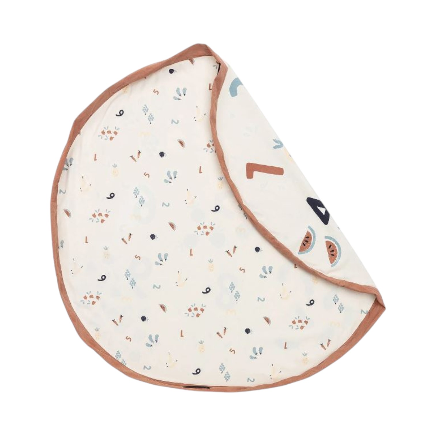 Wat is jouw favoriete getal? En wat eet je graag? Tel tot 9 met deze mooie, aardkleurige speelmat, bezaaid met vrolijke groenten en fruit zoals bananen, ananassen en watermeloenen. Deze speelmat moedigt kinderen niet alleen aan om getallen te leren, maar biedt ook een veilige plek om te spelen, alleen of samen met vrienden en familie. Met een dubbelzijdig kleurrijke print is de mat veelzijdig en gemakkelijk op te bergen door de tas simpelweg weer dicht te trekken. Perfect voor in de tuin, slaapkamer, op het strand, in het park of op school:leren was nog nooit zo leuk!