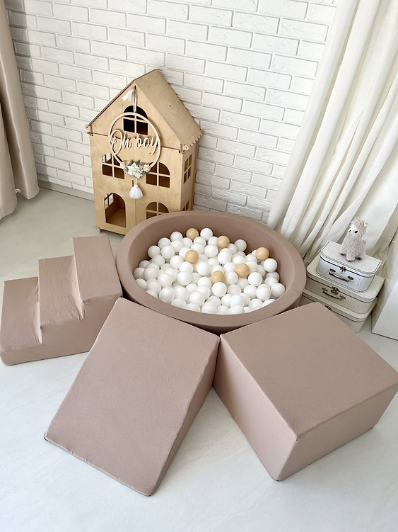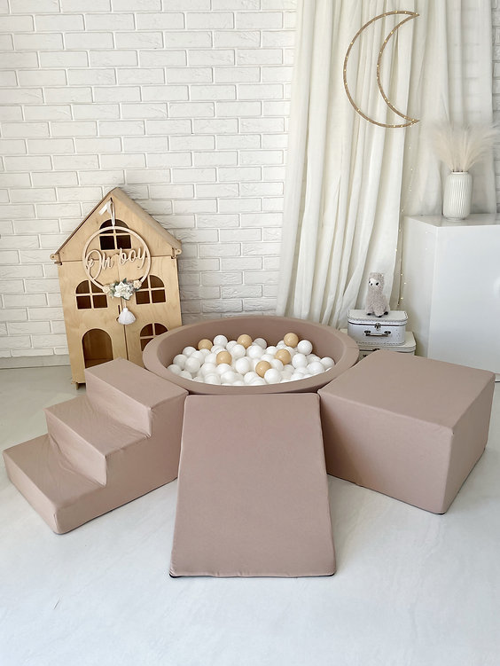 De Cotton 3 Elements-set met ballenbad is een veelzijdige speeloplossing die klimmen, bouwen en sensorisch spel combineert. De drie zachte schuimelementen – trapje, driehoek en blok – sluiten perfect aan op het ballenbad (90 × 30 cm) met 200 ballen, waardoor alles extra stabiel blijft en ballen netjes binnen blijven. Dankzij de ademende, Oeko-Tex 100-gecertificeerde katoenen hoezen is de set zacht, veilig en ideaal voor dagelijkse speelsessies. Het minimalistische design en de zachte kleuren maken deze set tot een stijlvolle toevoeging aan iedere kinderkamer of woonkamer. Perfect voor motorische ontwikkeling, coördinatie en eindeloos speelplezier.