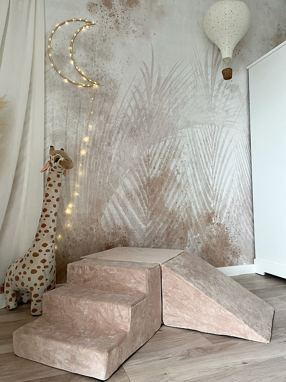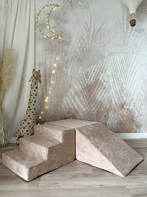 De Soft Velvet 3 Elements-set van MOJE is een stijlvolle en veilige speeloplossing voor jonge kinderen. De set bevat een trapje, een hoge driehoek en een rechthoekig blok, bekleed met zachte, Oeko-Tex 100-gecertificeerde velours stof (95% katoen, 5% elastaan). Ideaal om te klimmen, bouwen, glijden en creatief te spelen, terwijl motoriek, balans en coördinatie worden gestimuleerd. Dankzij het minimalistische design en de zachte kleuren past de set perfect in iedere kinderkamer of speelhoek. Gemaakt in de EU, duurzaam en eenvoudig te onderhouden met afneembare wasbare hoezen.