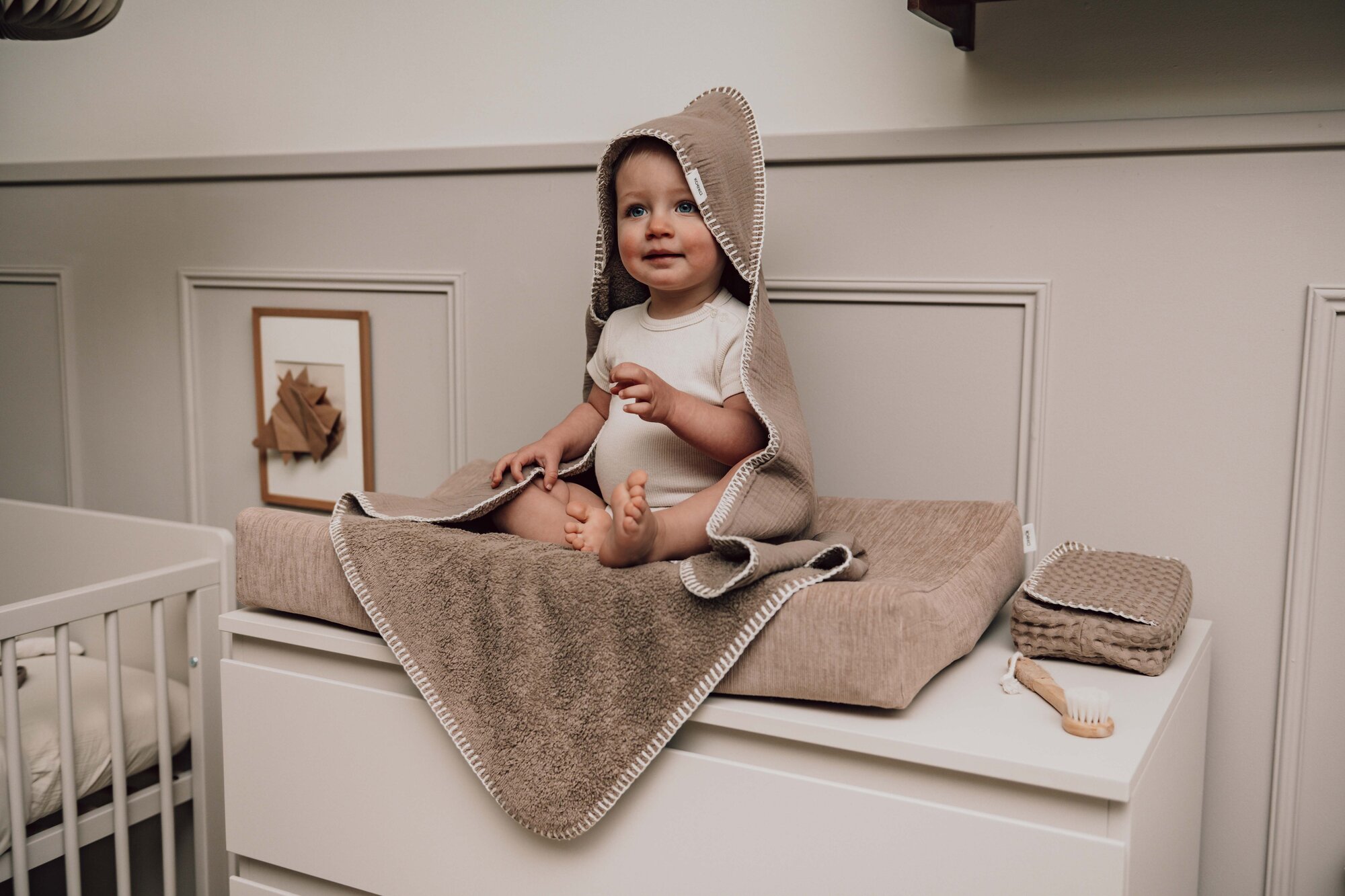 Koeka omslagdoek met capuchon – comfort en warmte voor je baby. Gemaakt van lusvast badstof en voorzien van een handige opening voor autostoel, wipstoel en buggy. Perfect voor thuis, onderweg en tijdens het voeden. Met ophanglus voor eenvoudig opbergen. Ideaal voor gebruik in de babykamer of bij het consultatiebureau.