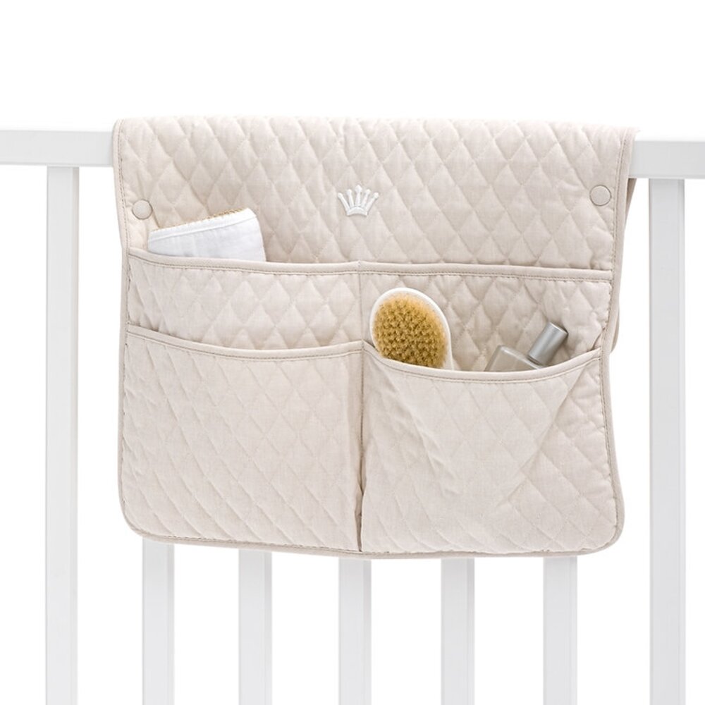 Gemaakt van luxueus beige gewatteerd katoen, straalt deze mand zachtheid en klasse uit. Als verfijnde finishing touch is de voorkant versierd met een subtiel geborduurde koninklijke kroon – een stijlvol accent voor elke babykamer.