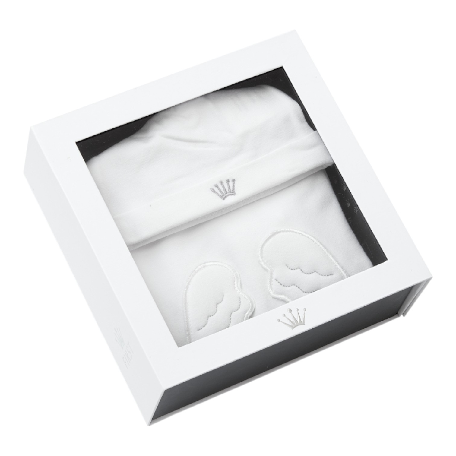 Set verpakt in een luxe-doosje met wit rompertje en muts.