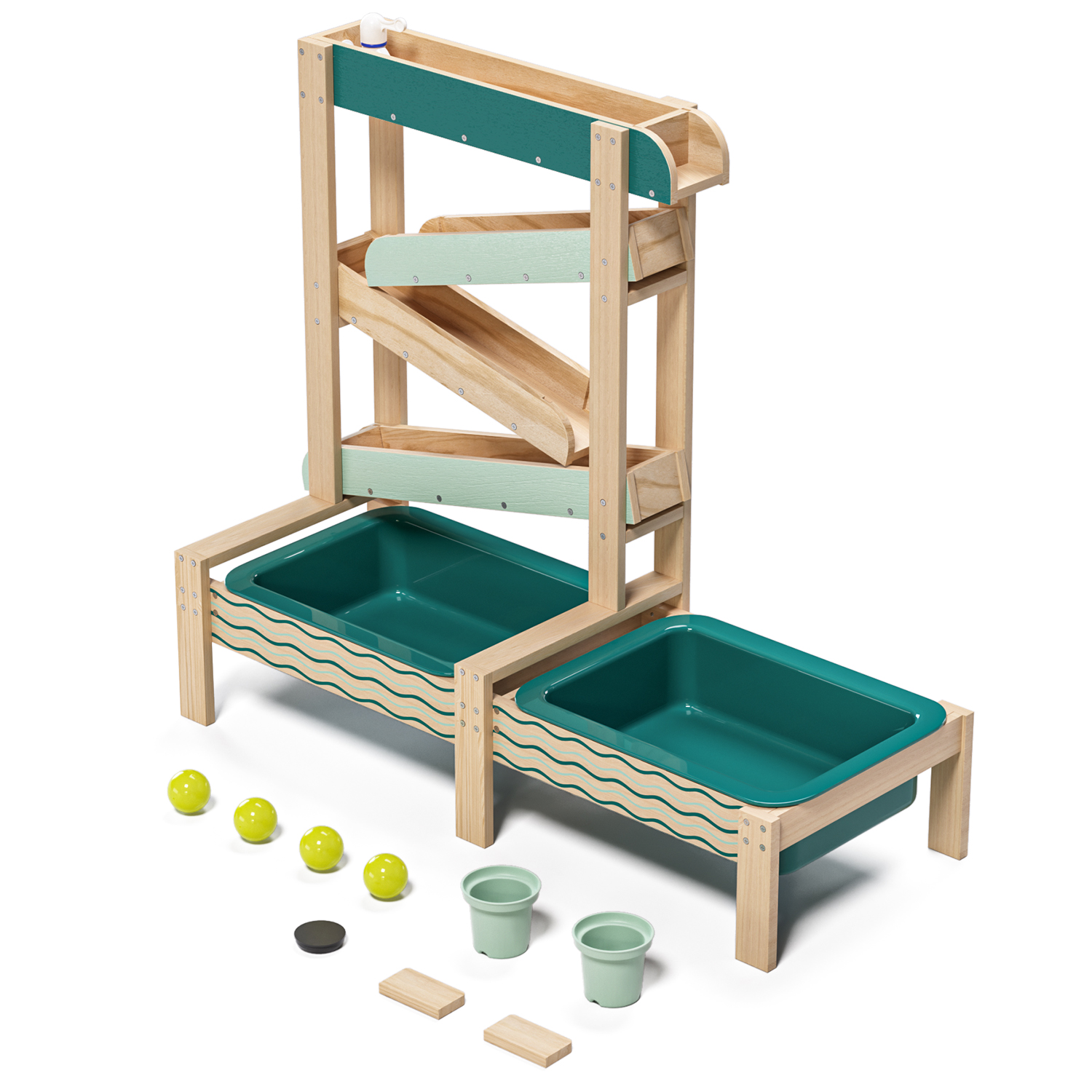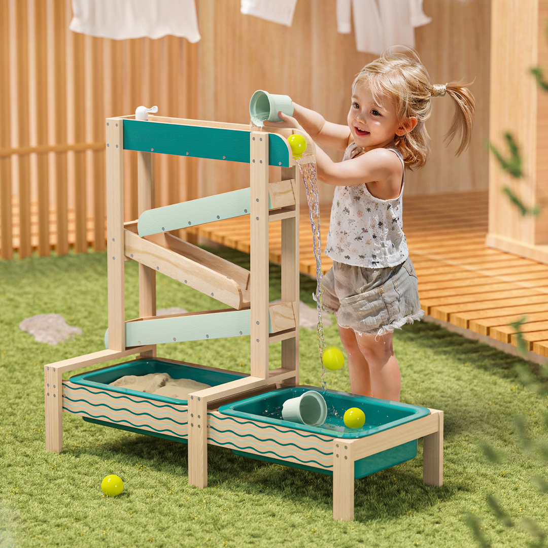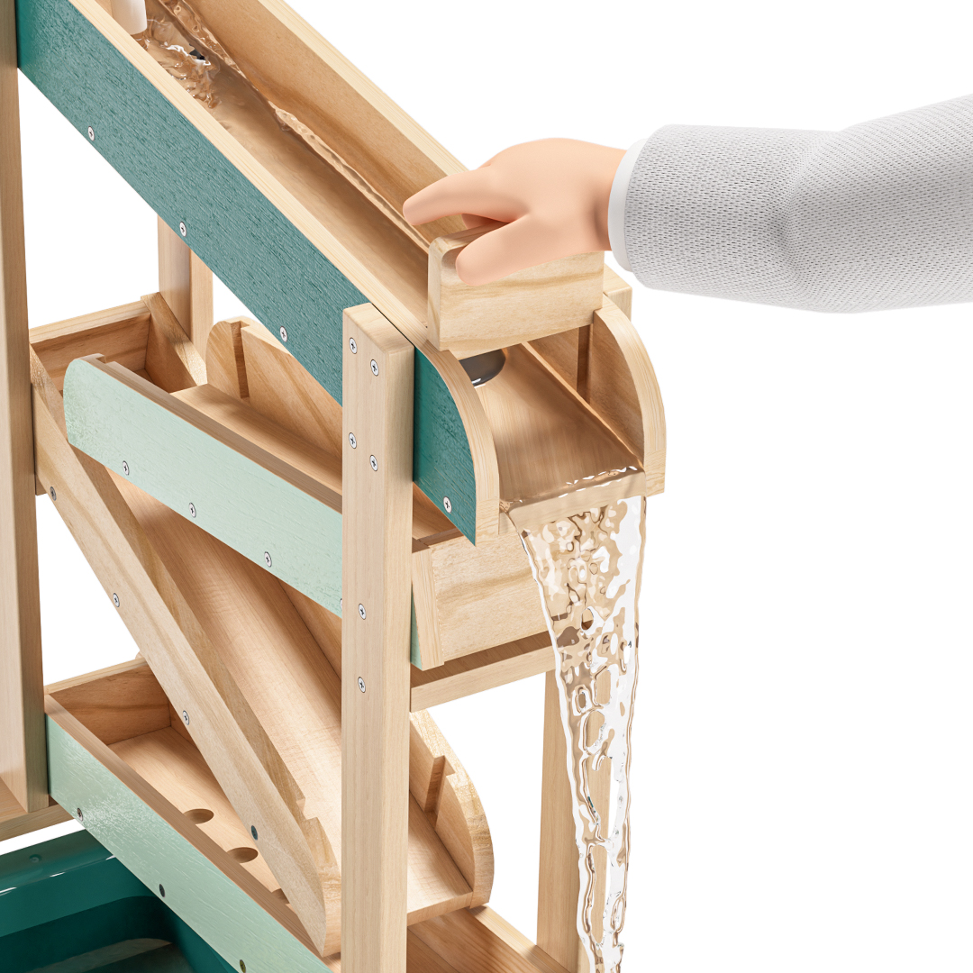 De Water Track is een houten buitenspeelset waarmee kinderen spelenderwijs water en zand ontdekken. Met meerdere waterbanen, verstelbare obstakels en twee grote speelbakken stimuleert dit spel experimenteren, oorzaak-en-gevolg en vroege STEM-vaardigheden. Perfect voor tuin, terras of balkon en ideaal voor actief en creatief buitenspelen.
