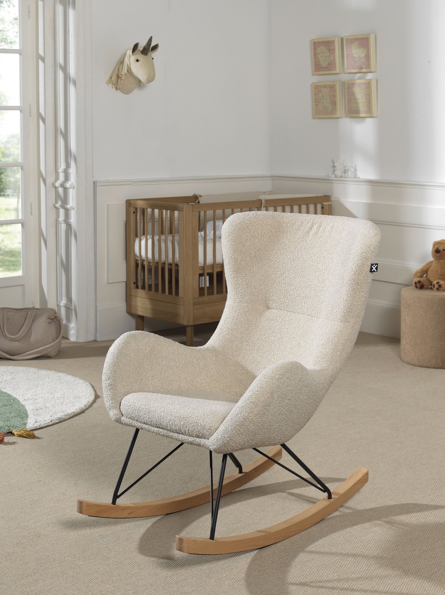 Deze schommelstoel in beige van de ROCKY collectie is afgewerkt in een unieke bouclé stof. De stoel zit niet alleen heel comfortabel, maar de ergonomische vorm van de stoel biedt ook voldoende ondersteuning aan ouders. Ideaal om te ontspannen, een boekje te lezen, even te knuffelen of voor een voedingsmoment in alle rust. Deze schommelstoel is niet alleen functioneel maar is door de mooie vormgeving ook een leuke decoratieve toevoeging aan iedere baby- of kinderkamer.