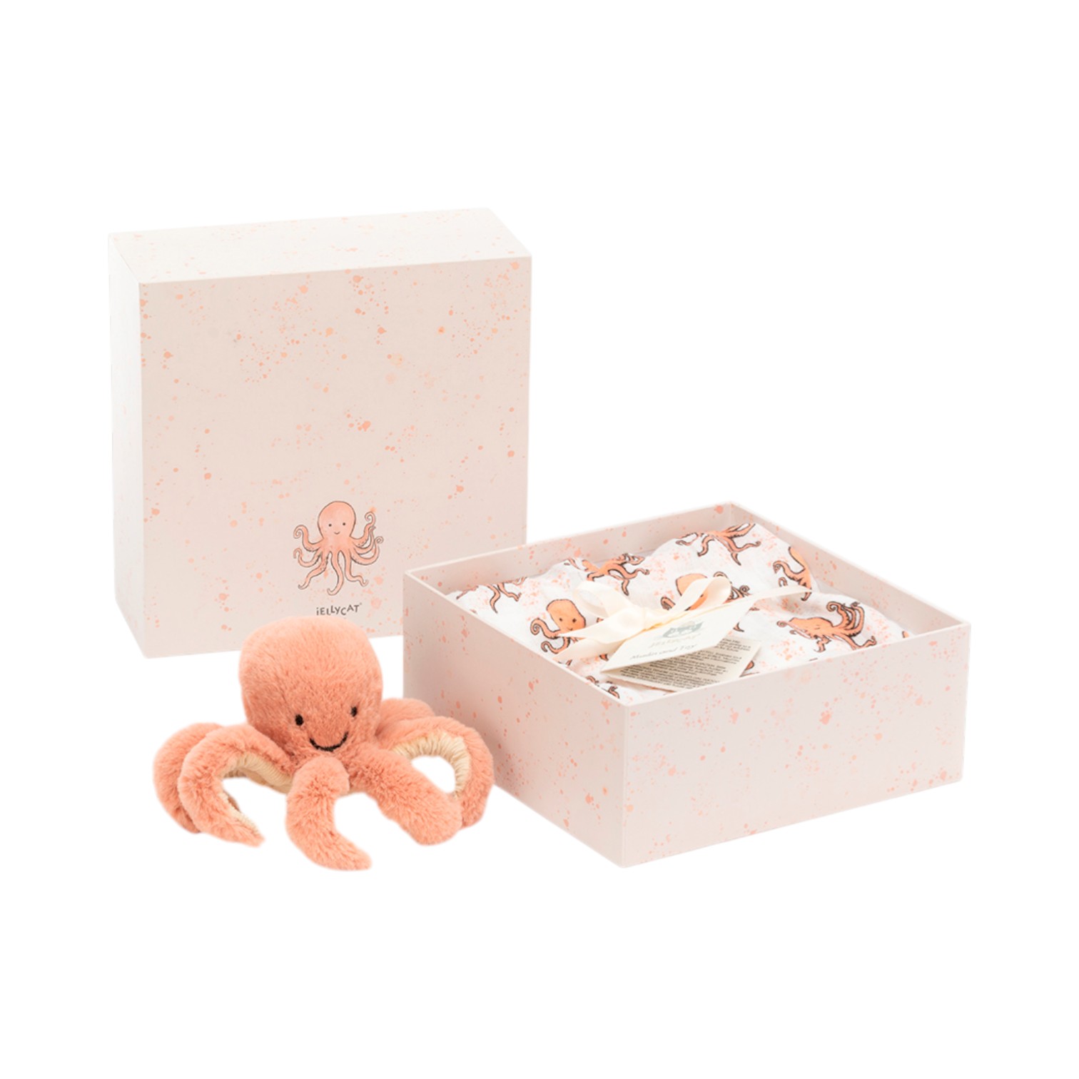 De Odell Octopus Gift Set van Jellycat bevat een pluizige knuffelinktvis en een bijpassend speeltje. Perfect als lief cadeau voor baby's en peuters, zacht en veilig vanaf de geboorte.