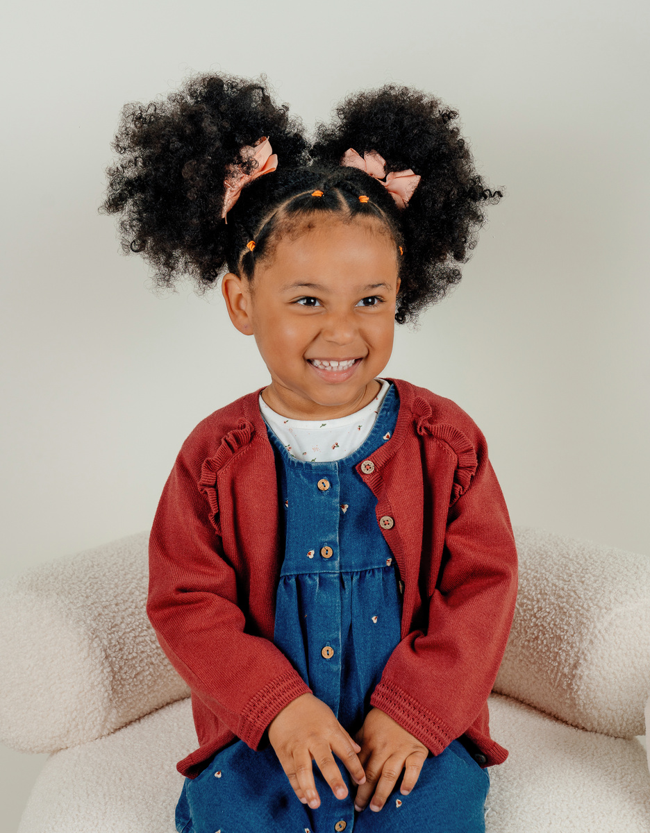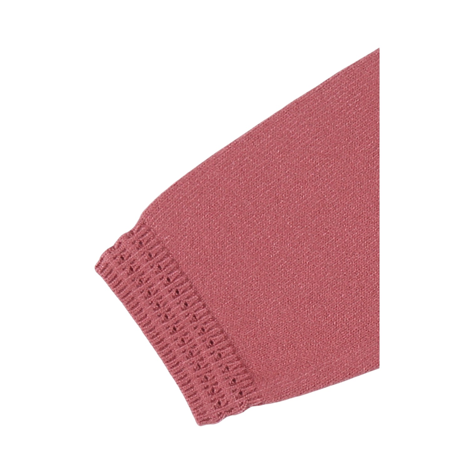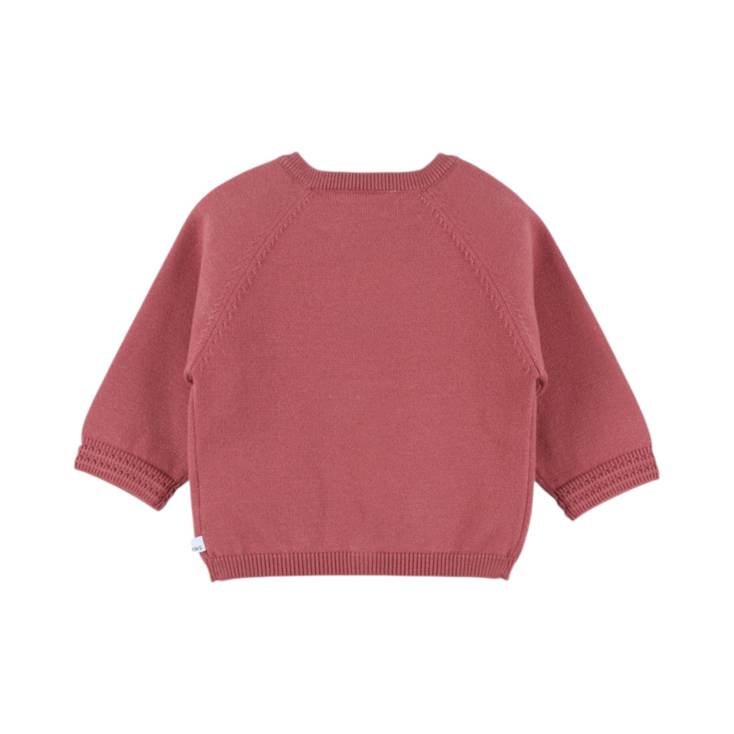 Dit framboosroze gebreide vestje is een onmisbaar stuk in de garderobe van je kleintje. De verticaal geplaatste knoopjes van kokosnoot aan de voorkant geven een subtiele elegante touch.