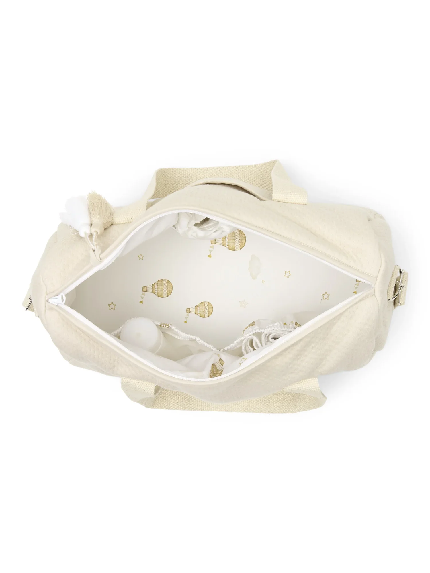 In deze handige mommy bag/ verzorgingstas kun je al de producten meenemen die je nodig hebt om je kindje onderweg te verzorgen. De binnenkant is geplastificeerd en heeft 3 vakken voor een flesjes, luiers en andere benodigdheden.