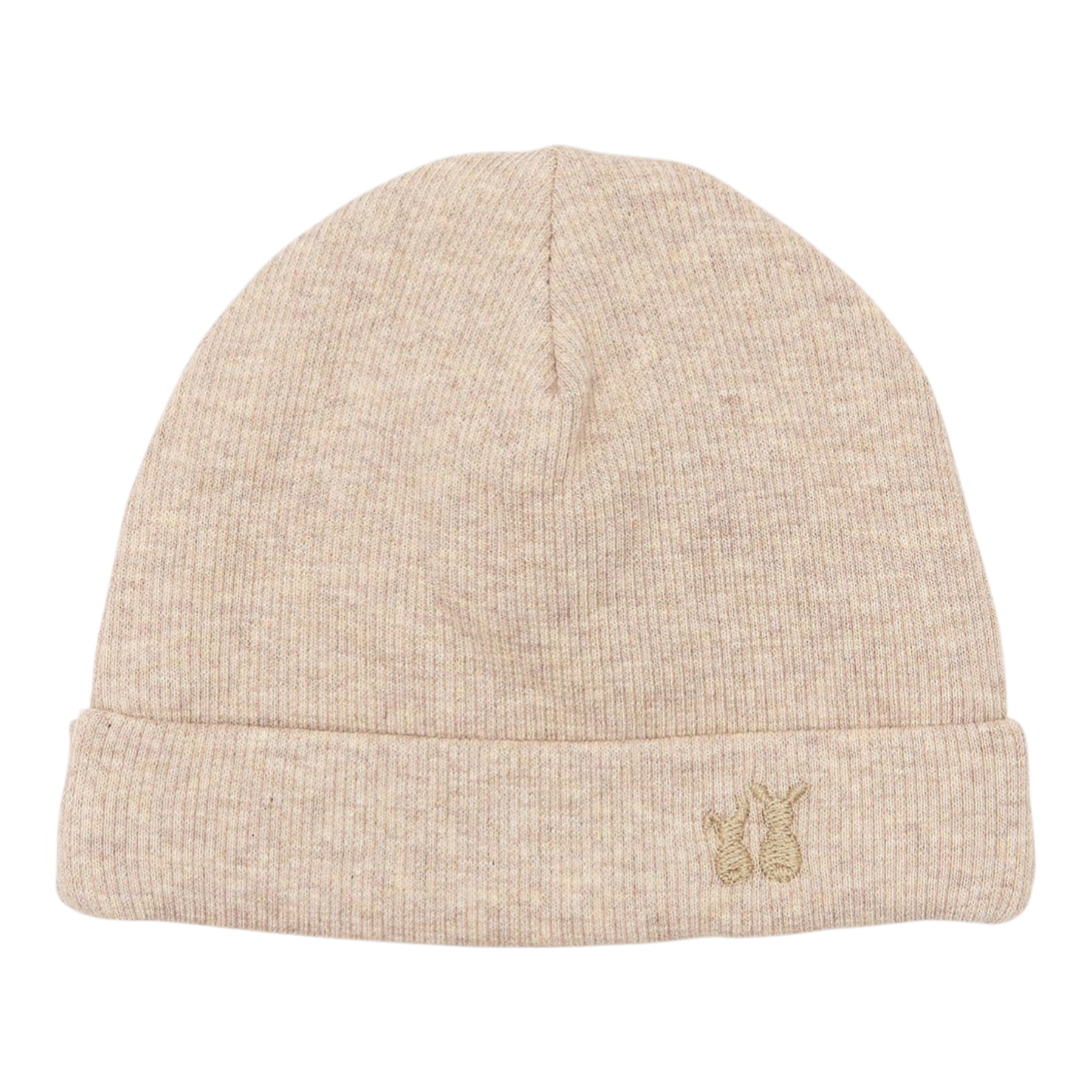Een zacht en stijlvol babymutsje van fijne ribstof in warme camel kleur, met geborduurde konijntjes, lief accent.