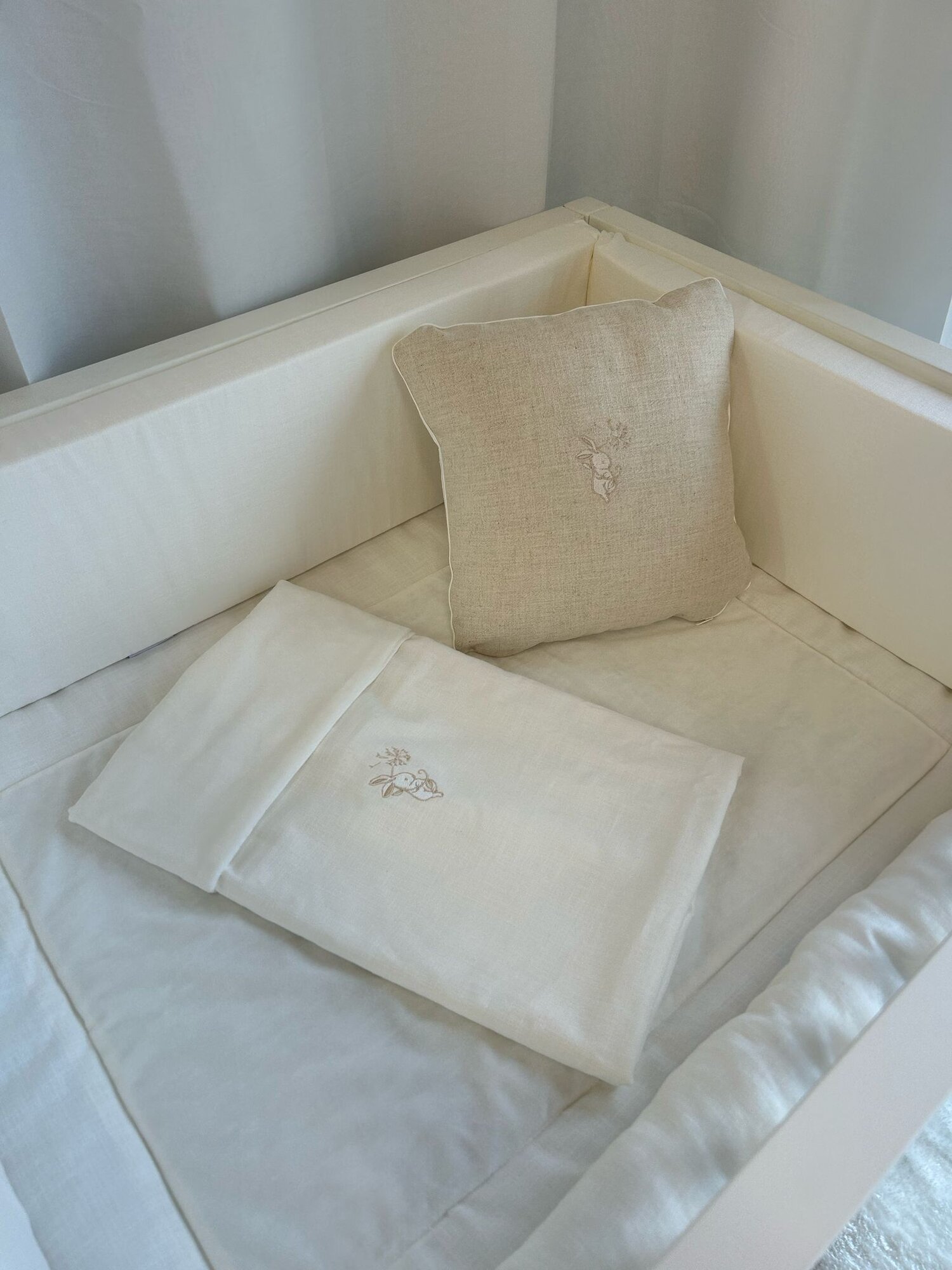 Maison Nalinewiegdeken voorkant linnen beige rondom met paspel katoen ivoor achterkant teddy ivoor kortharig