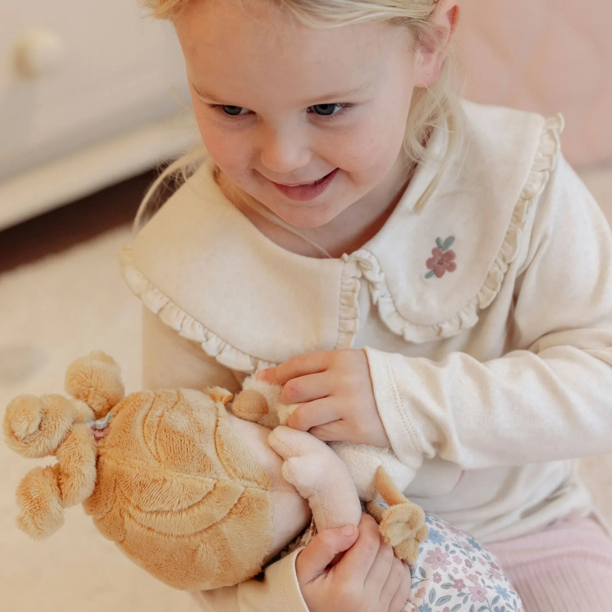 Maak kennis met knuffel babypop Julia, jouw zachte speelvriendin. Julia draagt een lief rompertje met bloemetjes en heeft een luier met klittenband. Dankzij magneetjes in haar handjes en oogjes kan ze kiekeboe spelen. Geef haar het flesje of knuffel samen met het kleine gansje. Julia nodigt uit tot zorgzaam spel en eindeloos knuffelen.