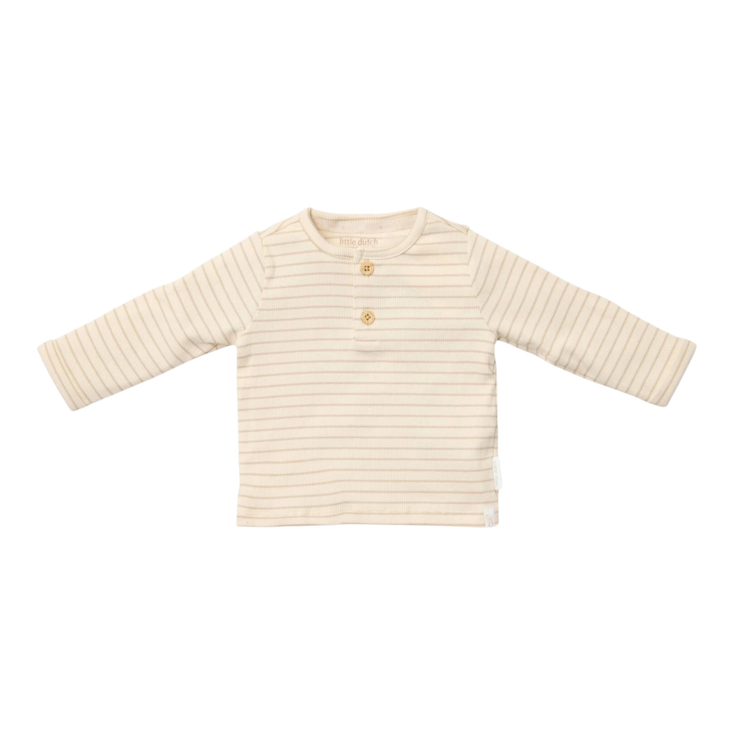 Dit Little Dutch T-shirt met lange mouwen in subtiele zandkleurige strepen is stijlvol én comfortabel. Gemaakt van zacht ribmateriaal met knoopjes in houtlook en biologisch katoen (Oekotex gecertificeerd). Perfect voor dagelijks gebruik.