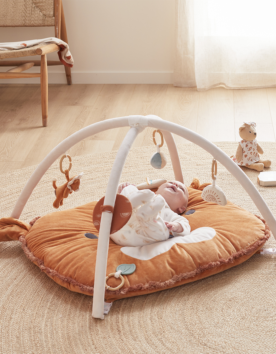 Dit karamelkleurige Babou speeltapijt van Noukies, gemaakt van zacht Veloudoux®, stimuleert de zintuigen met activiteiten zoals spiegel, rammelaar, pieper, belletje, bijtspeeltje en meer. Dankzij de dikke voering ligt je baby altijd comfortabel. De bogen en activiteiten zijn afneembaar, zodat het tapijt meegroeit met elke ontwikkelingsfase.