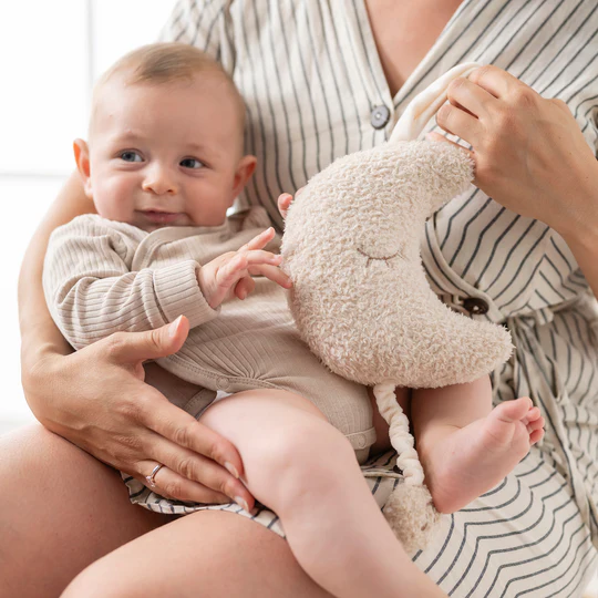 Een knuffel die muziek speelt én heerlijk zacht is om mee te knuffelen – dat is deze schattige maan! Dankzij het ingebouwde muziekdoosje wordt je kleintje getrakteerd op het rustgevende ''La-Le-Lu'' melodietje. Perfect om bij weg te dromen en rustig in slaap te vallen. De donzige stof voelt heerlijk zacht aan en ligt fijn in kleine handjes, waardoor deze muzikale knuffel al snel een favoriet wordt.