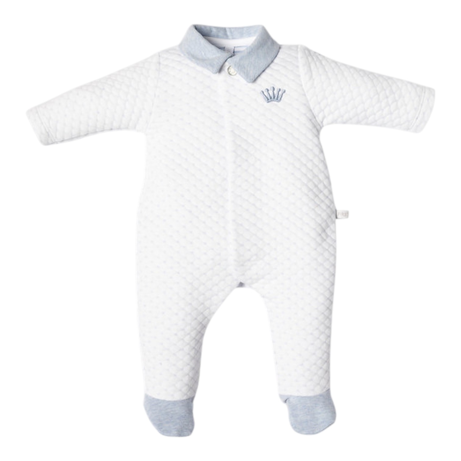 Dit babypakje in Oslo-jersey heeft een handige opening aan de voorkant voor eenvoudig aankleden. Fijne beige details sieren de kraag en voeten, wat een elegante uitstraling geeft. De FIRST logo-kroon borduurwerk op de voorkant maakt dit stijlvolle en comfortabele kledingstuk helemaal af.