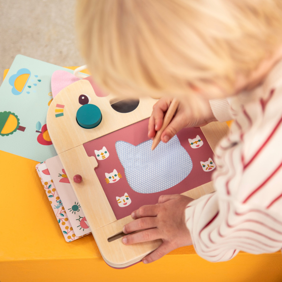 Laat de creativiteit van je kind groeien met de Lilliputiens Houten Leisteen Jeanne de Kat! Deze magische, herbruikbare tekenlei is perfect voor kinderen vanaf 18 maanden en combineert educatief spel met eindeloos tekenplezier.