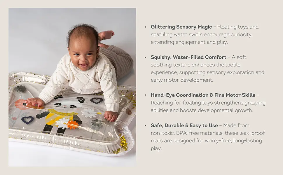 Duik in het plezier met de Taf Toys Watermat! Deze zachte, met water gevulde mat maakt buikliggen leuk en stimulerend. Het drijvende speelgoed in de mat prikkelt de zintuigen, terwijl baby's spelenderwijs hun spieren, hand-oogcoördinatie en fijne motoriek ontwikkelen. Perfect voor nieuwsgierige kleintjes vanaf 3 maanden, eenvoudig schoon te maken en ideaal voor dagelijks speelplezier.