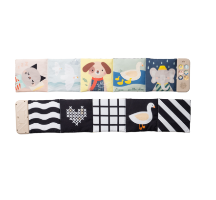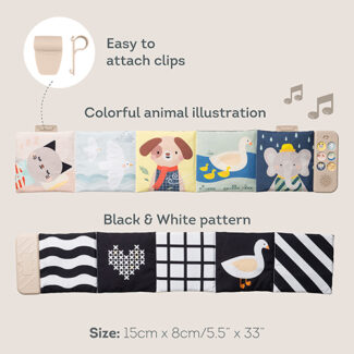 Ontdek het Taf Toys Newborn Soothing Book – een zacht, vrijstaand stoffen boek dat baby's vanaf dag één helpt te kalmeren en te stimuleren. Met zachte sensorische elementen en eenvoudige drukknoppen combineert dit boek zien, voelen en horen tot een rustgevende, multisensorische ervaring. Dankzij 5 dierengeluiden, 5 natuurgeluiden en 2 melodieën brengt het rust tijdens buikliggen, speeltijd in het wiegje of onderweg in de kinderwagen. Ideaal om je baby een gevoel van veiligheid en geborgenheid te geven, waar je ook bent.