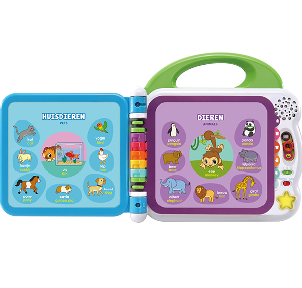 Druk op de knipperende ster-toets om vrolijke liedjes te horen en leuke weetjes te ontdekken. Dankzij de 12 kleurrijke thema's groeit de woordenschat van je kindje op een natuurlijke en speelse manier.