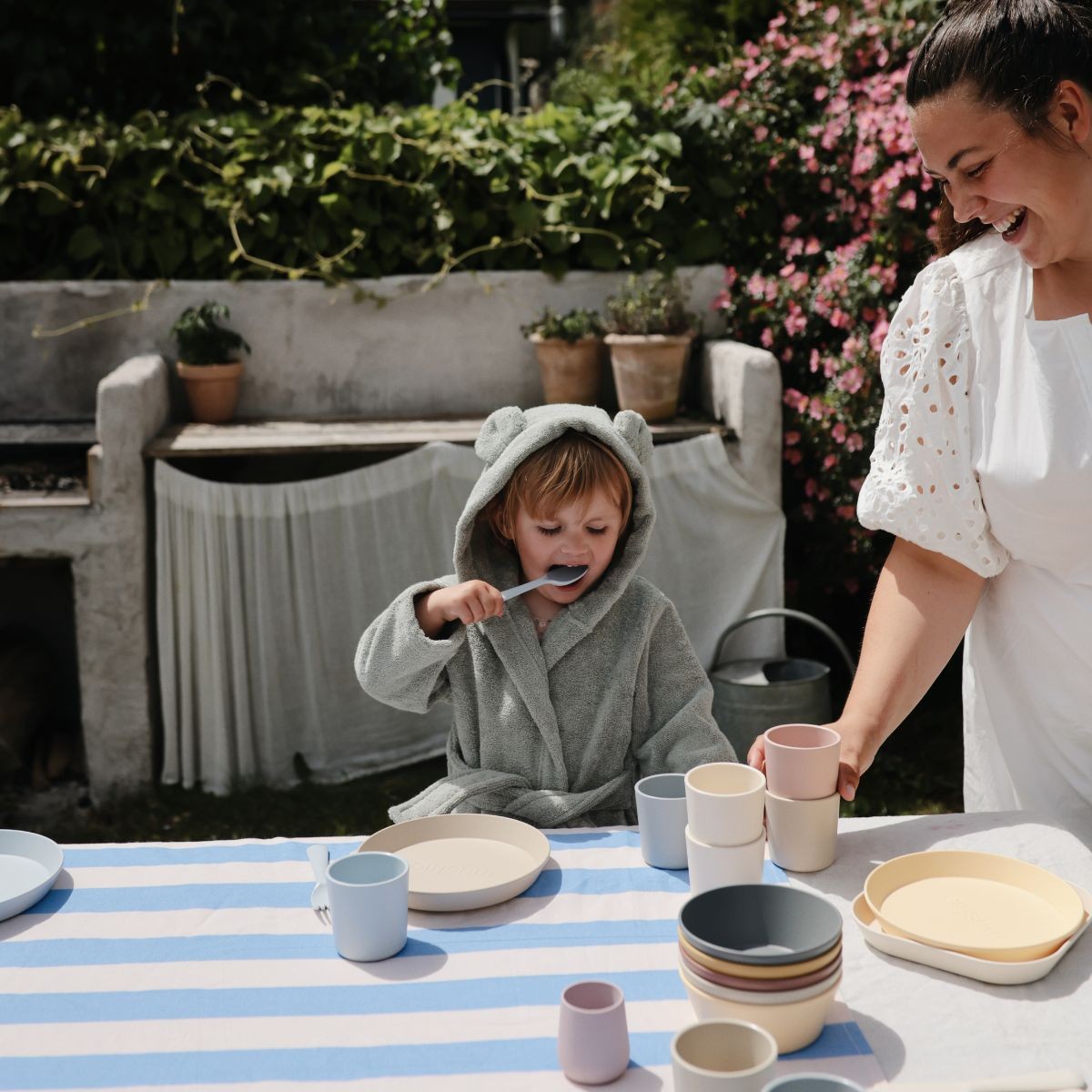 De badjas is gemaakt van 100% biologisch katoen en voelt heerlijk zacht en absorberend aan. Perfect voor warme knuffelmomentjes na het badderen.