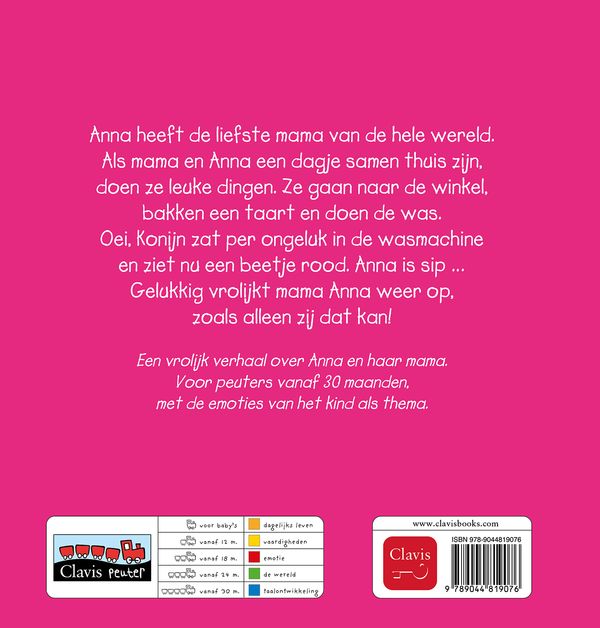 Anna heeft de liefste mama van de hele wereld. Als mama en Anna een dagje alleen zijn, doen ze leuke dingen samen. Ze fietsen gezellig naar de winkel, bakken een heerlijke taart en doen de was. Maar hé, Konijn is in de wasmachine gekropen! Anna is een beetje sip, Konijn ziet er gek uit nu ... Gelukkig vrolijkt mama Anna weer op, zoals alleen zij dat kan! Een vrolijk verhaal over Anna en haar mama.