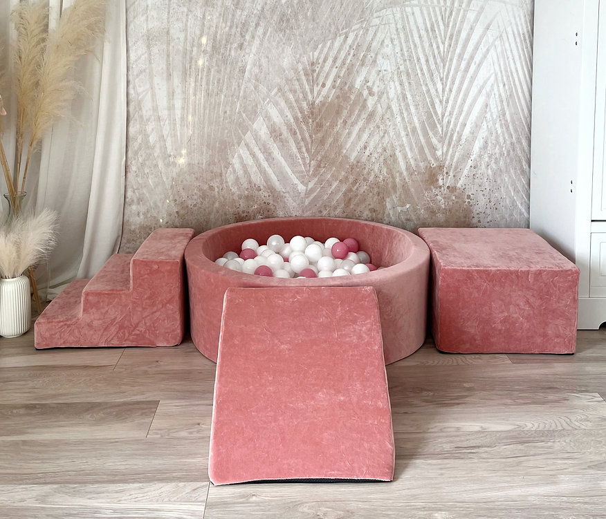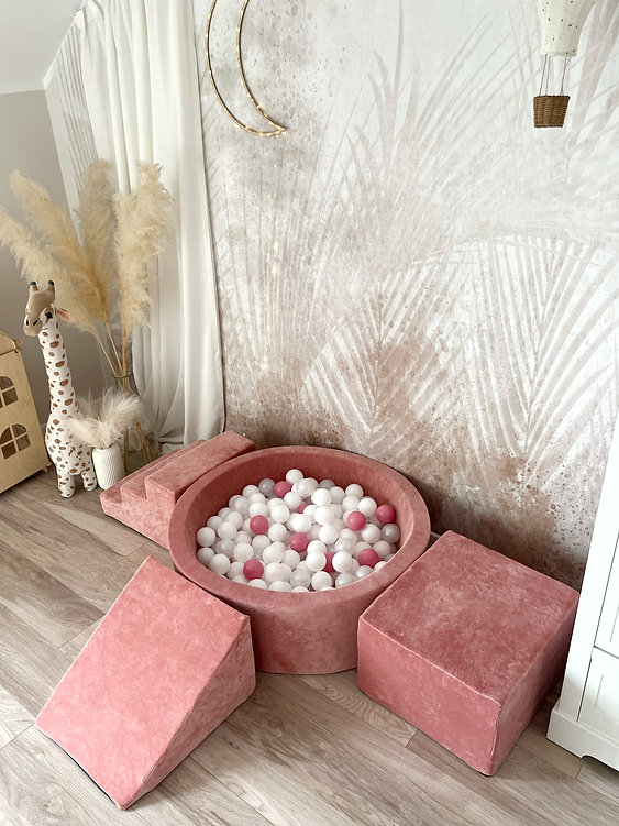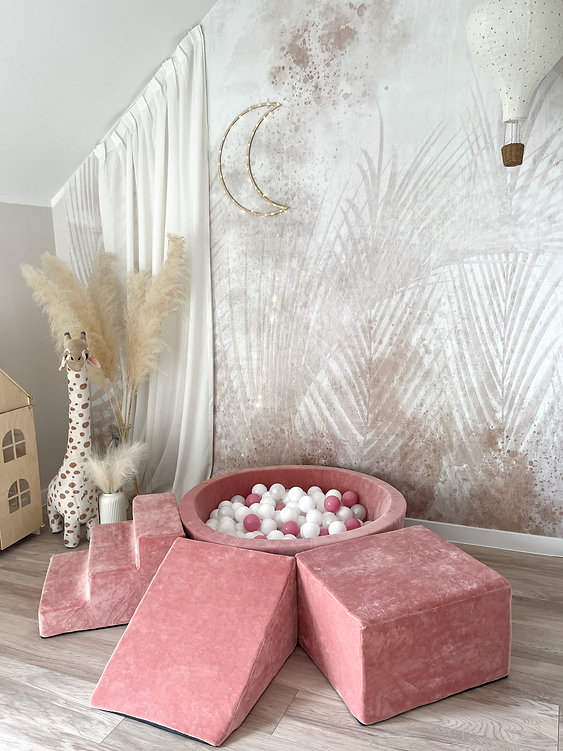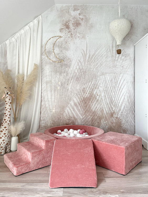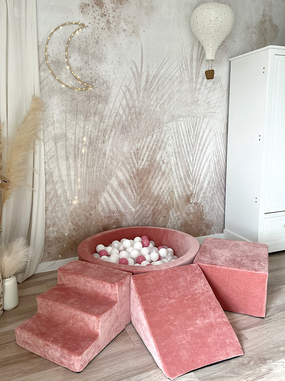 De Soft Velvet 3 Elements-set met ballenbad combineert klimmen, bouwen en sensorisch spel in één veilige en stijlvolle set. De drie zachte schuimelementen – trapje, driehoek en balk – sluiten perfect aan op het ballenbad van 90 × 30 cm met 200 ballen, waardoor alles extra stabiel blijft en de ballen netjes binnen blijven. De zachte soft velvet hoezen (95% katoen, 5% elastaan, Oeko-Tex 100) zorgen voor comfort en veiligheid, terwijl motoriek, coördinatie en creativiteit worden gestimuleerd. Een minimalistisch, stijlvol ontwerp dat moeiteloos in elke kinderkamer of speelhoek past. Gemaakt in de EU en eenvoudig schoon te houden met afneembare, wasbare hoezen.