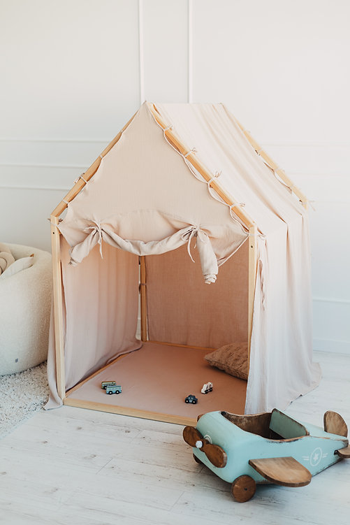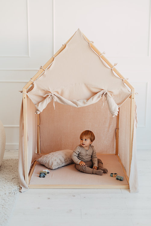 De Moje Playhouse Scandi is een minimalistisch en stijlvol speelhuisje met een zachte mousseline cover, perfect voor iedere kinderkamer. Het stevige houten frame (110 × 110 cm) met afgeronde hoeken en schuin dak zorgt voor een veilige en gezellige speelplek. De set wordt geleverd met een comfortabele 4 cm dikke mat en een Oeko-Tex 100 gecertificeerde mousseline cover die tot op de grond valt. Dankzij de striklinten, losse voorkant van stof en decoratieve afwerking creëer je eenvoudig een knusse, geborgen sfeer. Het tijdloze Scandinavische design past perfect bij andere MOJE-items en biedt een heerlijke plek om te lezen, spelen of ontspannen.