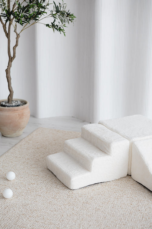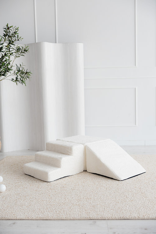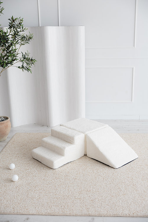 De Teddy 3 Elements-set van MOJE is een zachte en veilige speeloplossing voor jonge kinderen, perfect te combineren met een ballenbad of als zelfstandig klim- en bouwparcours. De set bestaat uit een trapje, schuine driehoek en blok, bekleed met knuffelzachte teddy-stof (100% soft plush, Oeko-Tex 100) voor comfort en een warme uitstraling. Ideaal om motoriek, evenwicht en creativiteit te stimuleren. Afneembare, wasbare hoezen maken onderhoud eenvoudig. Een stijlvolle en functionele toevoeging aan elke kinderkamer of speelhoek, gemaakt in Europa.