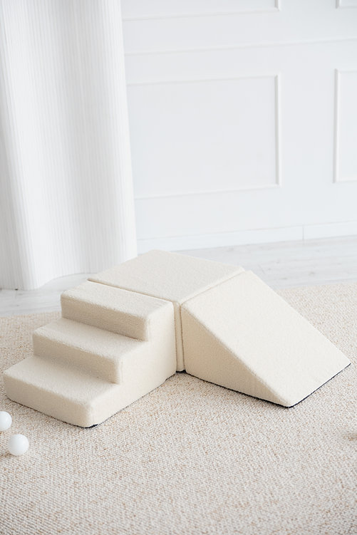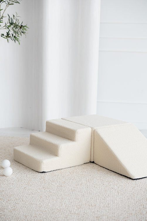De Bouclé 3 Elements-set van MOJE is een stijlvolle en veilige speelset, perfect als aanvulling op een ballenbad of als zelfstandig speelparcours. De set bestaat uit een trapje, hoge driehoek en blok, bekleed met luxe bouclé stof (100% polyester, Oeko-Tex 100) en gevuld met stevig schuim. Ideaal om motoriek, balans en creativiteit te stimuleren, terwijl kinderen klimmen, bouwen en ontdekken. Het minimalistische design en de zachte kleuren maken de set een elegante toevoeging aan elke kinderkamer of speelhoek. Afneembare, wasbare hoezen zorgen voor eenvoudig onderhoud en langdurig speelplezier.