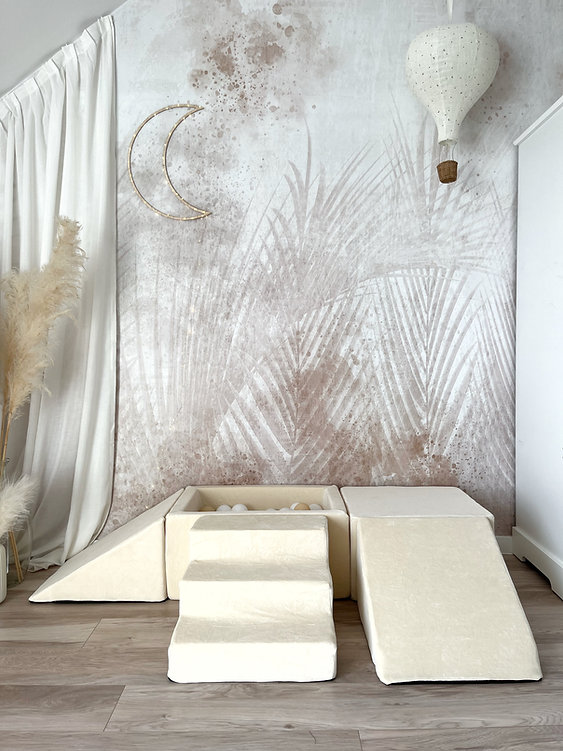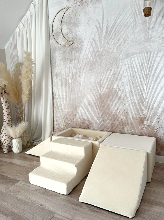 De Soft Velvet foam speelset is een veelzijdige speelplek die plezier en motorische ontwikkeling stimuleert. De set bevat vier schuimblokken in verschillende vormen en een ballenbad (65 × 35 × 30 cm) met 100 ballen, ideaal om te klimmen, bouwen en spelen. De zachte velours hoezen (95% katoen, 5% elastaan, Oeko-Tex 100) bieden comfort en veiligheid, terwijl het minimalistische design en de zachte kleuren perfect passen in iedere kinderkamer of woonkamer. Afneembare, wasbare hoezen maken onderhoud eenvoudig. Geschikt voor kinderen vanaf 1 jaar en ideaal voor meerdere kinderen tegelijk.