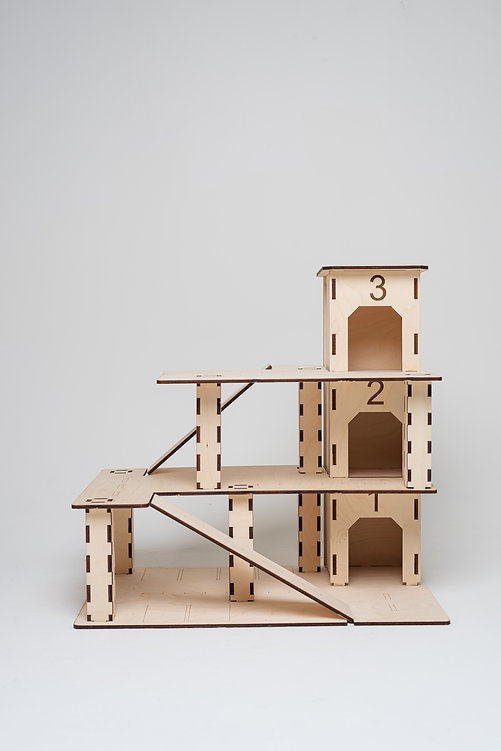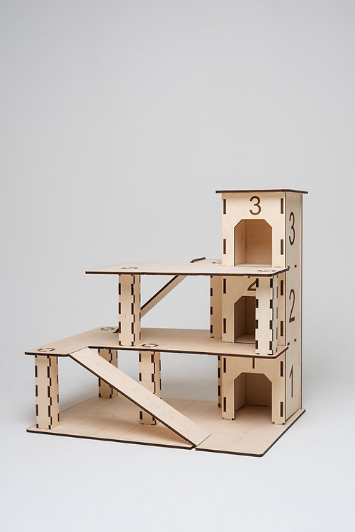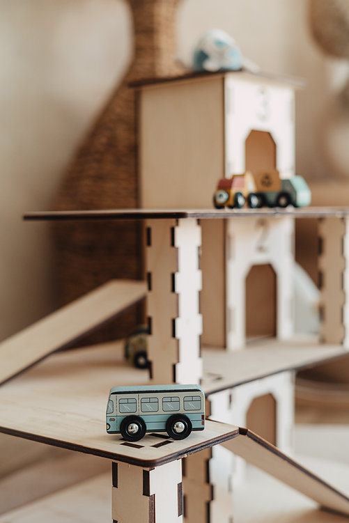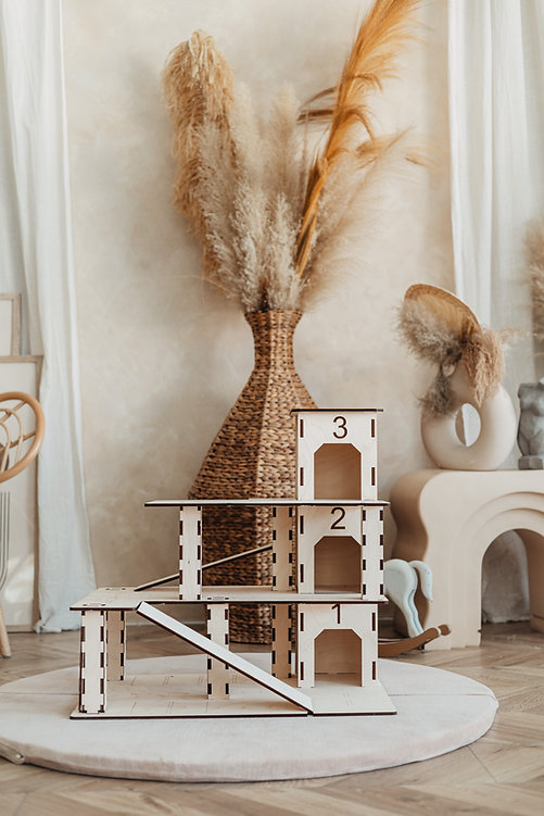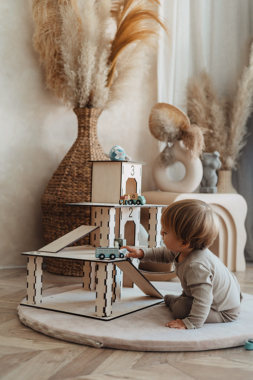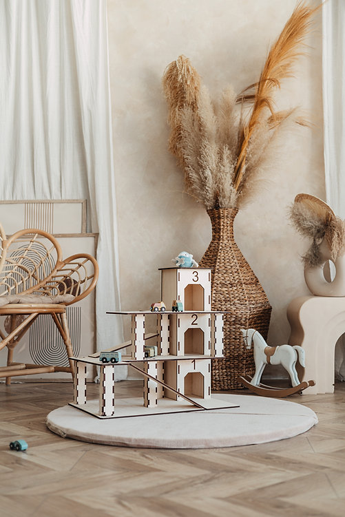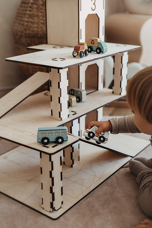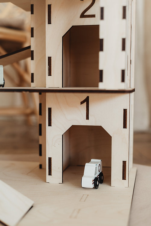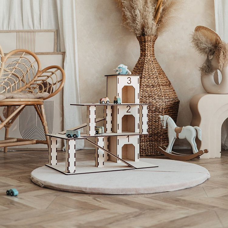Deze handgemaakte, drie verdiepingen tellende garage is vervaardigd van hoogwaardig FSC-gecertificeerd berkenmultiplex, wat zorgt voor verantwoord houtgebruik en aandacht voor het milieu. De stevige constructie en duurzame materialen garanderen langdurig gebruik en weerstand tegen dagelijks spel.