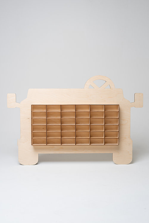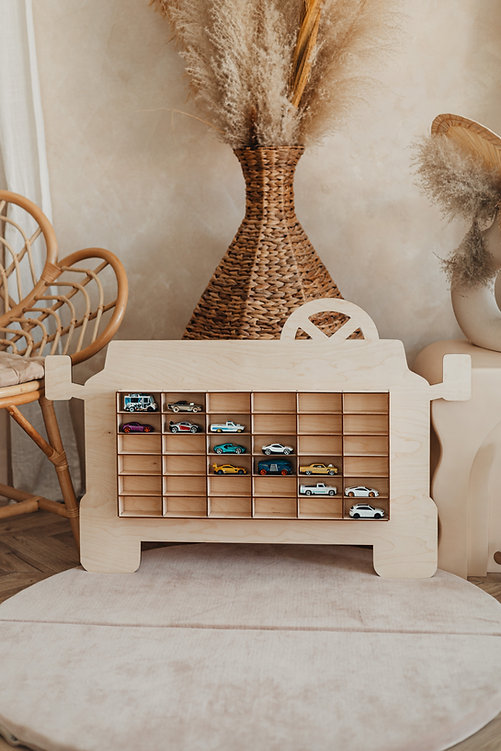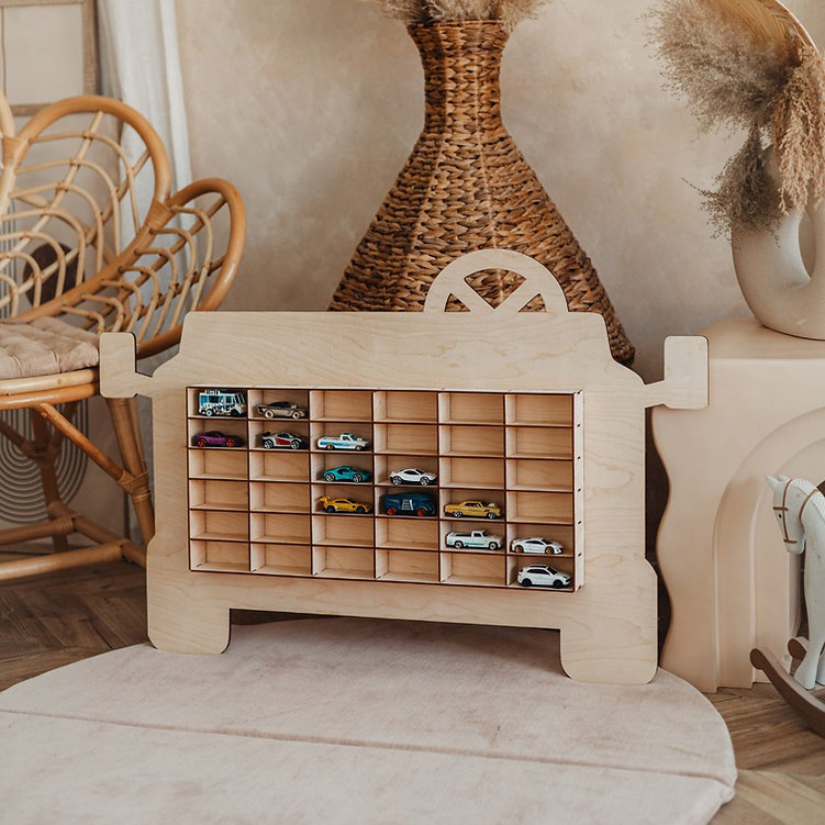 Deze organizer in de vorm van een auto combineert praktische opbergruimte met esthetiek en biedt plaats voor een collectie speelgoedauto's, figuren of andere kleine accessoires. Het minimalistische, kindvriendelijke design stimuleert de verbeelding en maakt het product ook tot een decoratief element in de kinderkamer. De natuurlijke houtkleur past bij moderne interieurstijlen zoals boho, Scandinavisch of eco.
