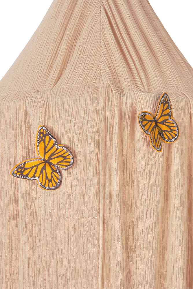 Creëer een gezellig en fantasierijk hoekje in de kinderkamer met de Klamboe Canopy Crepe Swan Rose uit de Swan-collectie. Deze handgemaakte klamboe van lichte, gestructureerde crepe-stof geeft een zachte, elegante sfeer, terwijl subtiele vlinderdetails in verschillende tinten een speels accent toevoegen. Perfect voor dromen, spelen en een knusse omgeving voor je kindje.