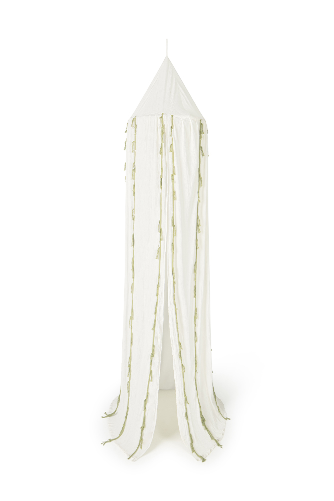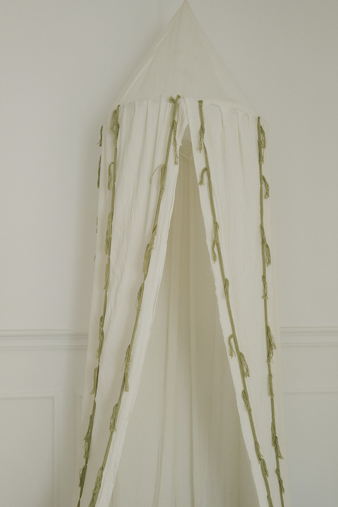 Breng een vleugje zwaan-magie in de kinderkamer met de Klamboe Canopy Crepe Swan Ivory uit de Swan-collectie. Deze handgemaakte klamboe in natuurlijke ivoortinten met subtiele matcha-accenten creëert een zachte, elegante sfeer. De delicate ruches zijn geïnspireerd door de elegante South Lloron-stijl en maken van elk hoekje een knusse, fantasierijke plek om te spelen en te dromen.