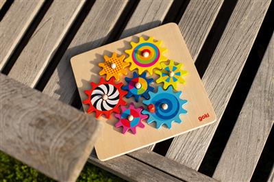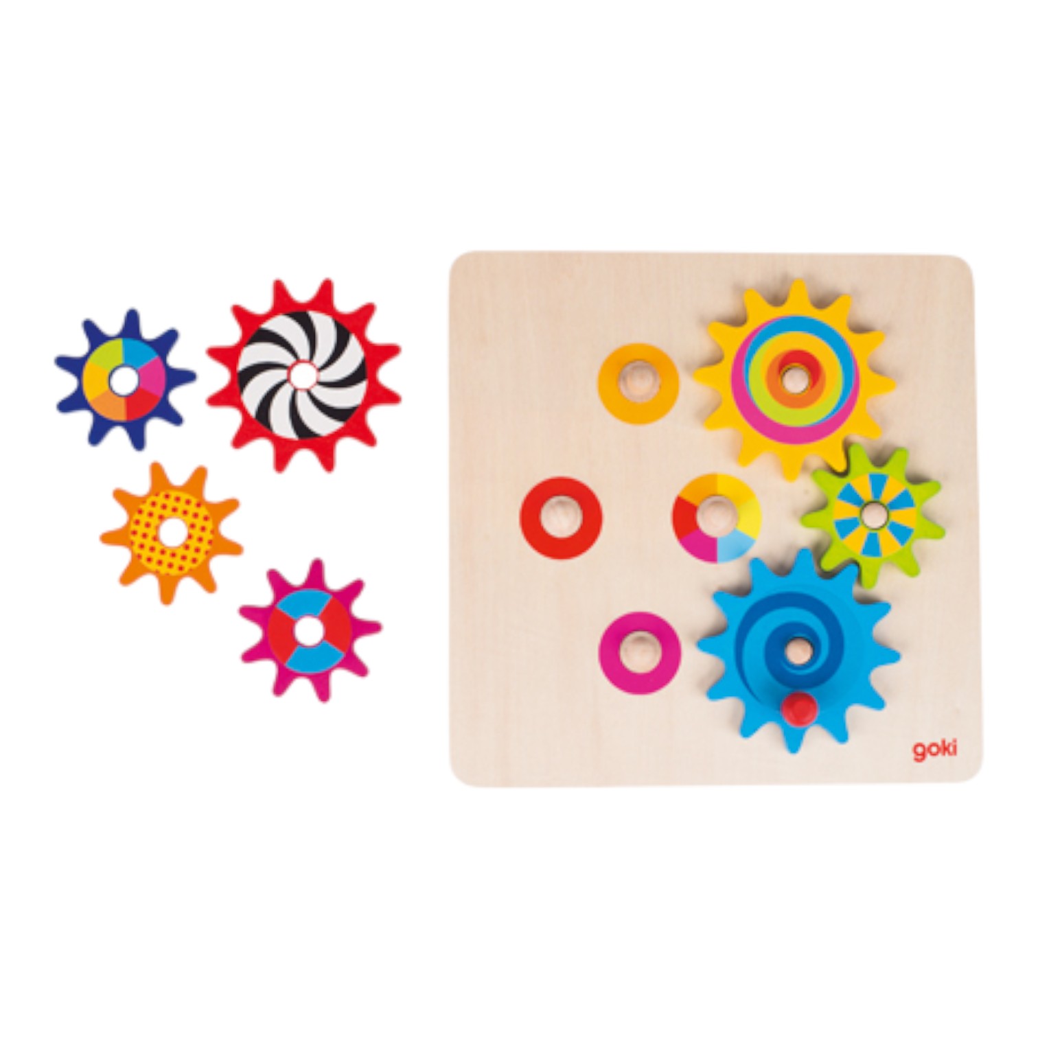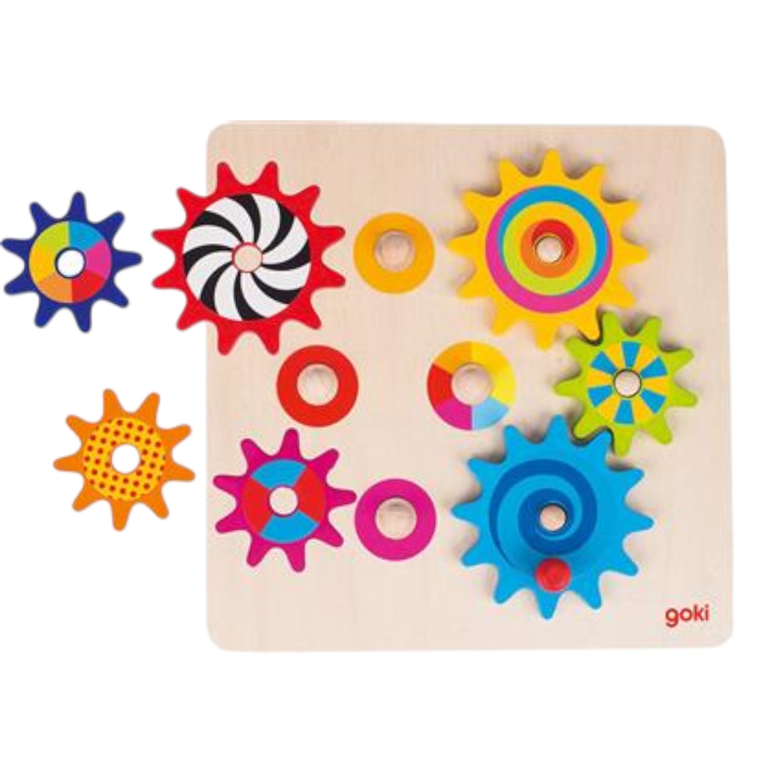 Ontdek het Goki tandwielspel, waar creativiteit en logisch denken samenkomen. Kinderen plaatsen de kleurrijke houten tandwielen op het bord en testen hun ontwerp door aan het grote blauwe wiel te draaien. Werkt het systeem en draaien alle wielen in de juiste richting? De zorgvuldig gekozen illustraties vormen samen met de bewegende tandwielen een prachtig geheel. Een speelse en leerzame activiteit die motoriek, probleemoplossend denken en fantasie stimuleert.