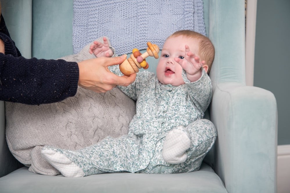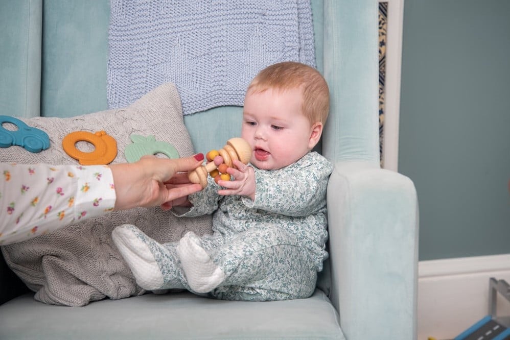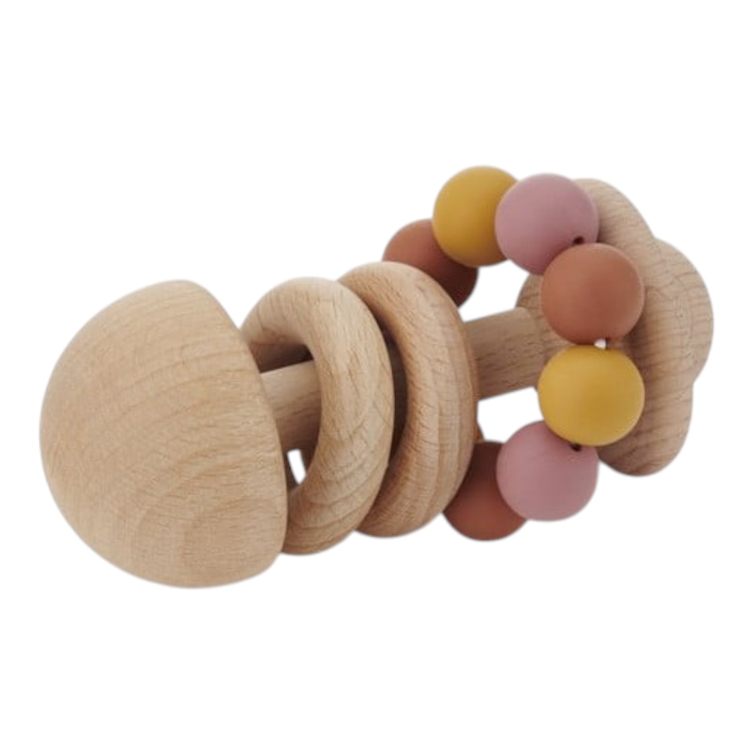 Massief beukenhouten rammelaar met houten ringen en tactiele siliconen kralen voor extra zintuiglijke verkenning en behendigheid.