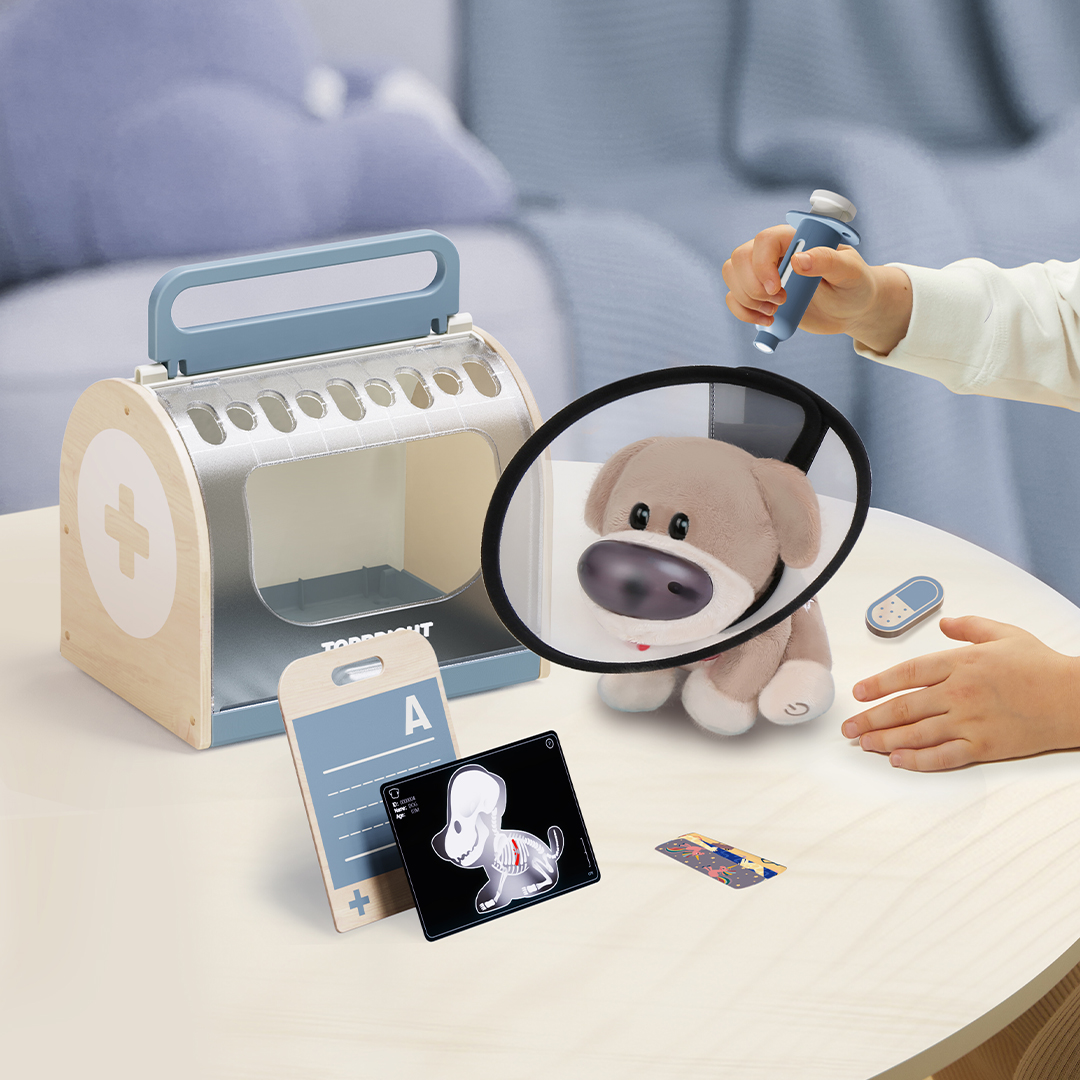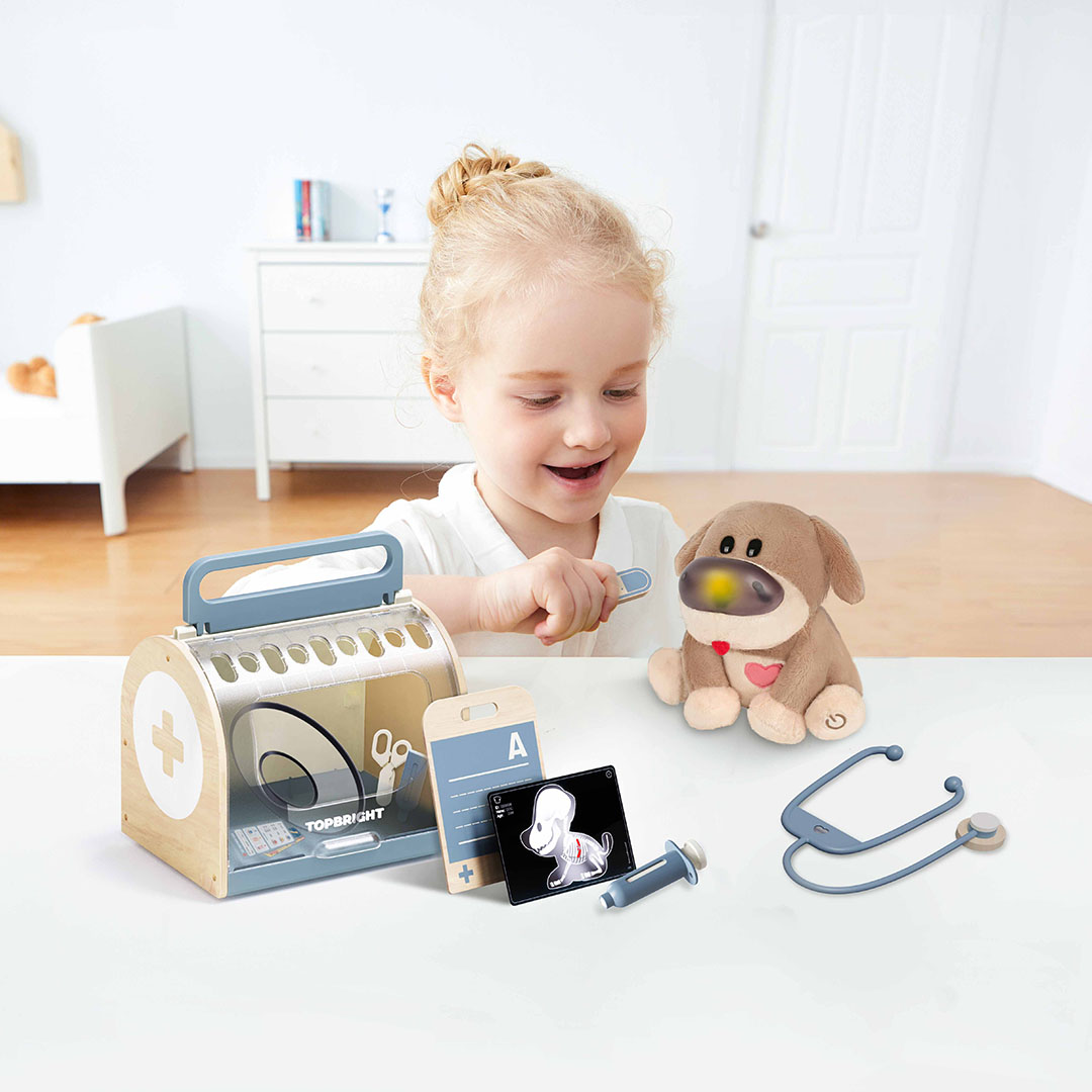 De Topbright Care Pets DR. Dog Vet Kit laat kinderen spelenderwijs kennismaken met dierenzorg. Deze interactieve dierenartsset bevat een zachte pluchen hond met licht- en geluidsreacties en realistische doktersaccessoires zoals een stethoscoop, thermometer en spuit. Kinderen leren zorgzaamheid, probleemoplossend denken en empathie via fantasierijk rollenspel dat creativiteit en zelfvertrouwen stimuleert.