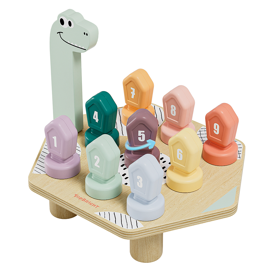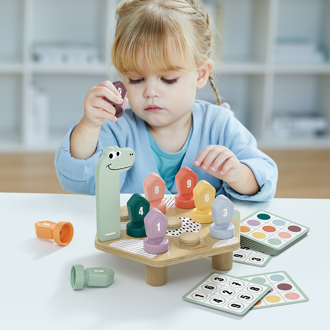 Met het Happy Dino Twist spel van TOPBRIGHT ontdekken kinderen vanaf 36 maanden op een speelse manier kleuren en cijfers. Door kleurrijke, genummerde deksels op de rug van de dinosaurus te schroeven en de opdrachten op de dubbele kaarten na te bootsen, stimuleren kinderen fijne motoriek, hand-oogcoördinatie, cognitieve vaardigheden en creatief denken. Een leuk en leerzaam spel dat leren combineren met spelen!
