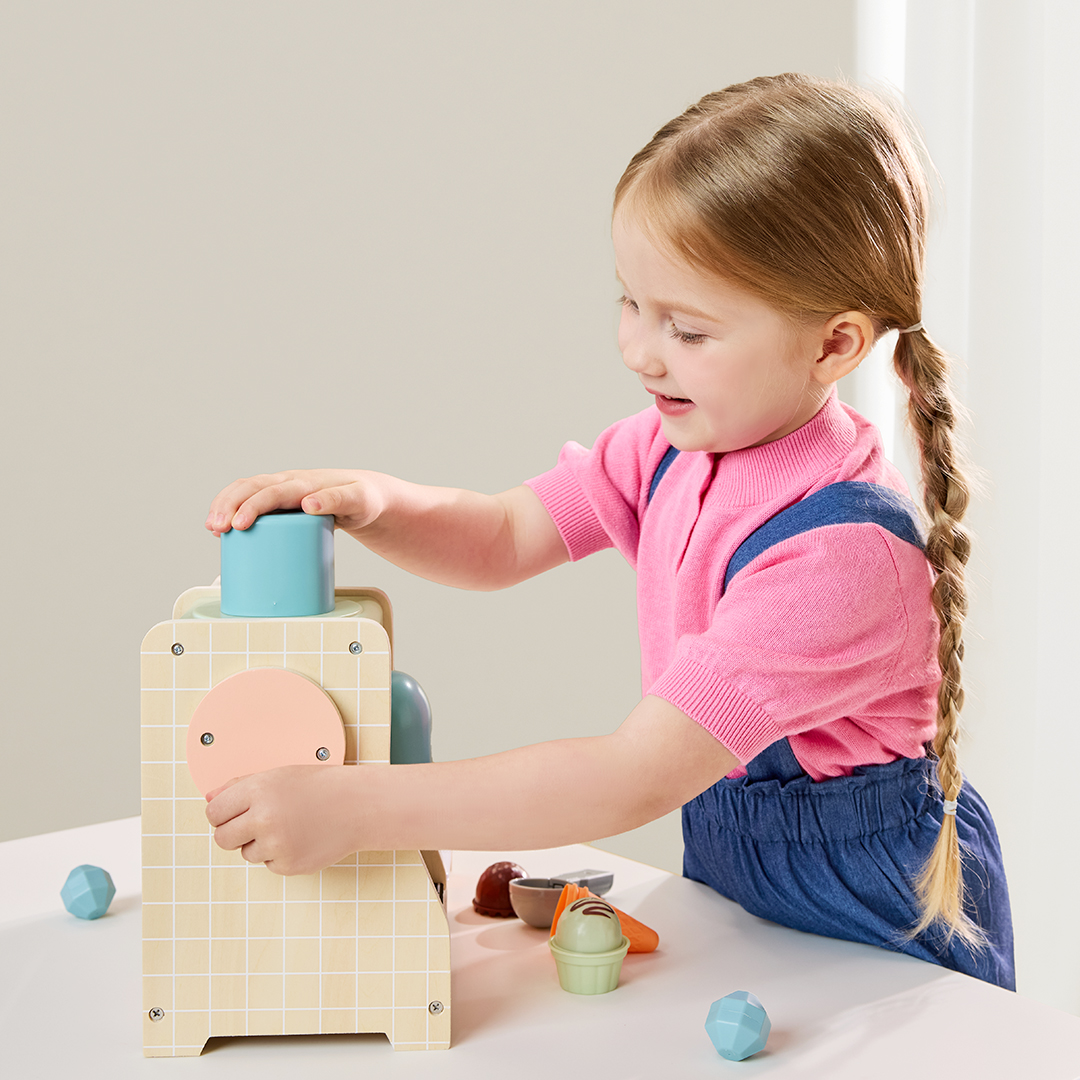 De Montessori Ice Cream Boutique is een interactieve houten ijswinkel die spel en leren combineert. Kinderen vanaf 3 jaar scheppen ijsjes, volgen bestelkaartjes en oefenen tellen, motorische vaardigheden en sociale interactie. Dankzij het open-ended, Montessori-geïnspireerde ontwerp stimuleert deze speelset creativiteit, fantasierijk rollenspel en vroege STEM-vaardigheden.