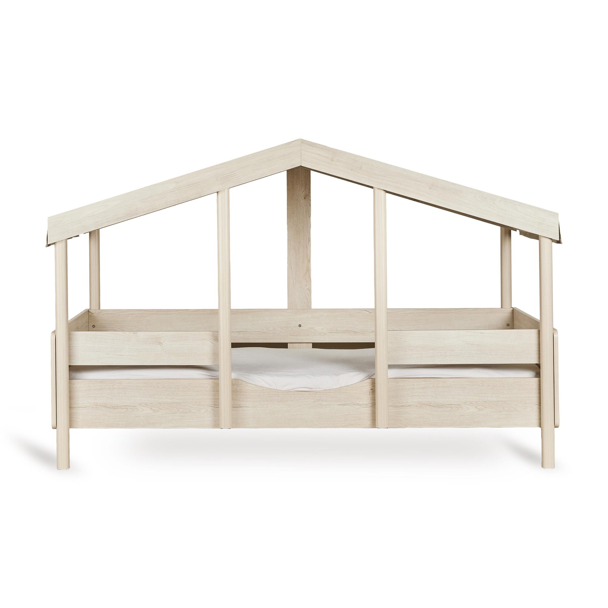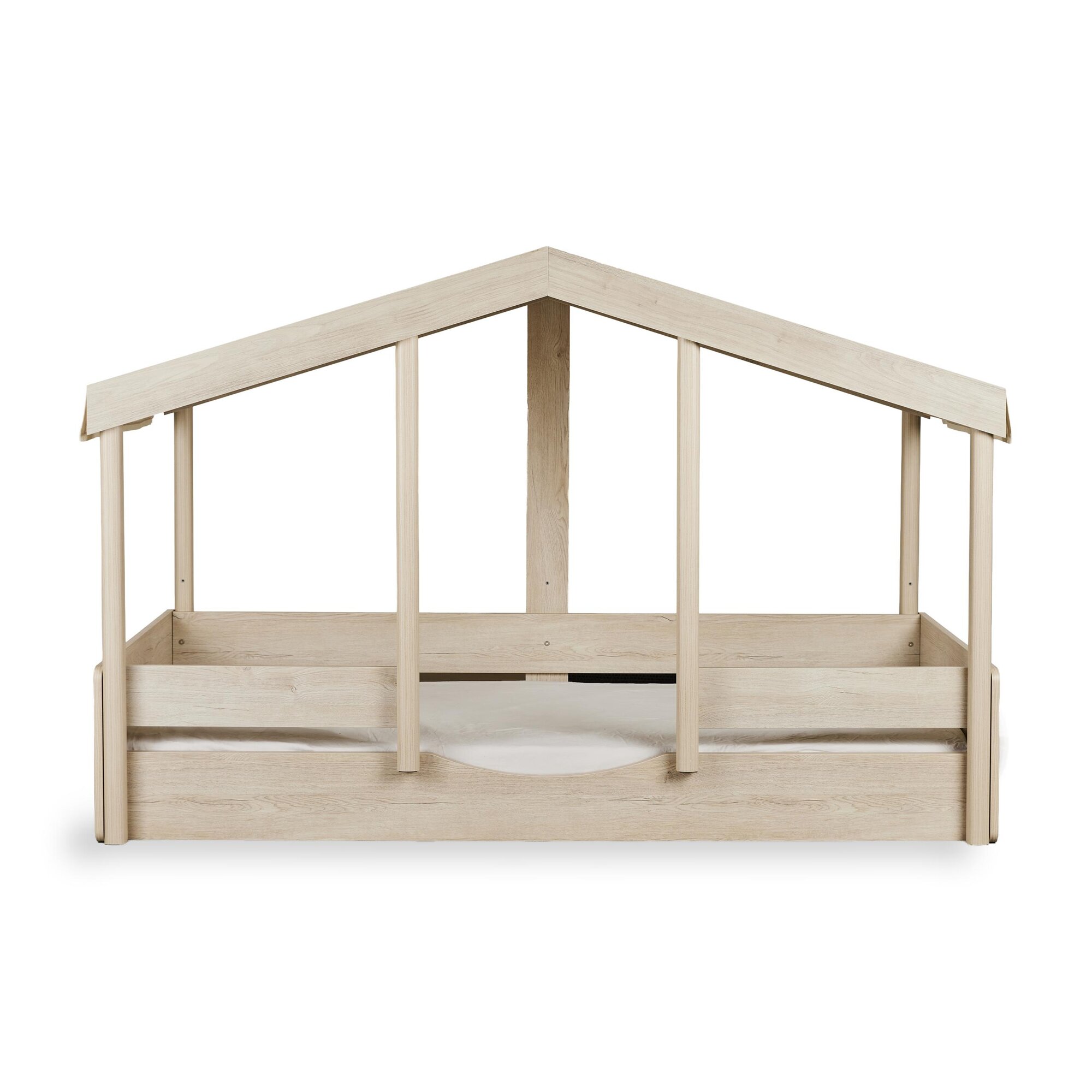 Het Montessori Bed is een sfeervol huisbedje dat avontuur en rust combineert. De speelse huisvorm geeft direct een gezellige uitstraling in de kinderkamer, waar je kleintje zich helemaal thuis voelt. Kies de opstelling die bij jullie past: de lage Montessori-style geeft je kindje de vrijheid om zelfstandig in en uit bed te kruipen, terwijl de opstelling op pootjes zorgt voor een luchtiger effect. Maak het bed compleet met een apart verkrijgbaar stoffen dak in zachte kleuren zoals Butter of Chocolat, eenvoudig te bevestigen met velcro. Zo ontstaat een knus en geborgen plekje voor zoete dromen.