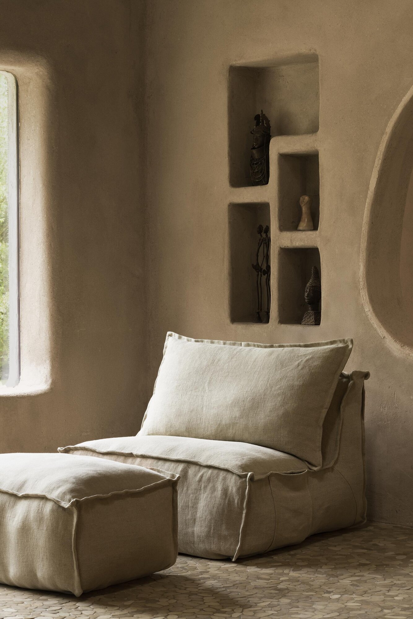 De Linen Ottoman is de perfecte aanvulling op de Linen Lounger. Bekleed met hetzelfde zachte, ademende linnen en vormgegeven in een rustige, organische lijn, biedt hij extra comfort voor je benen of dienst als flexibel bijzetmeubel.