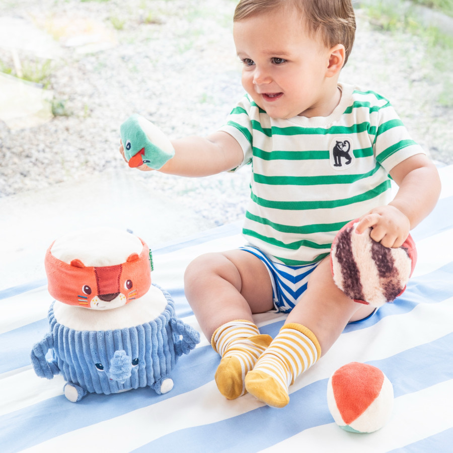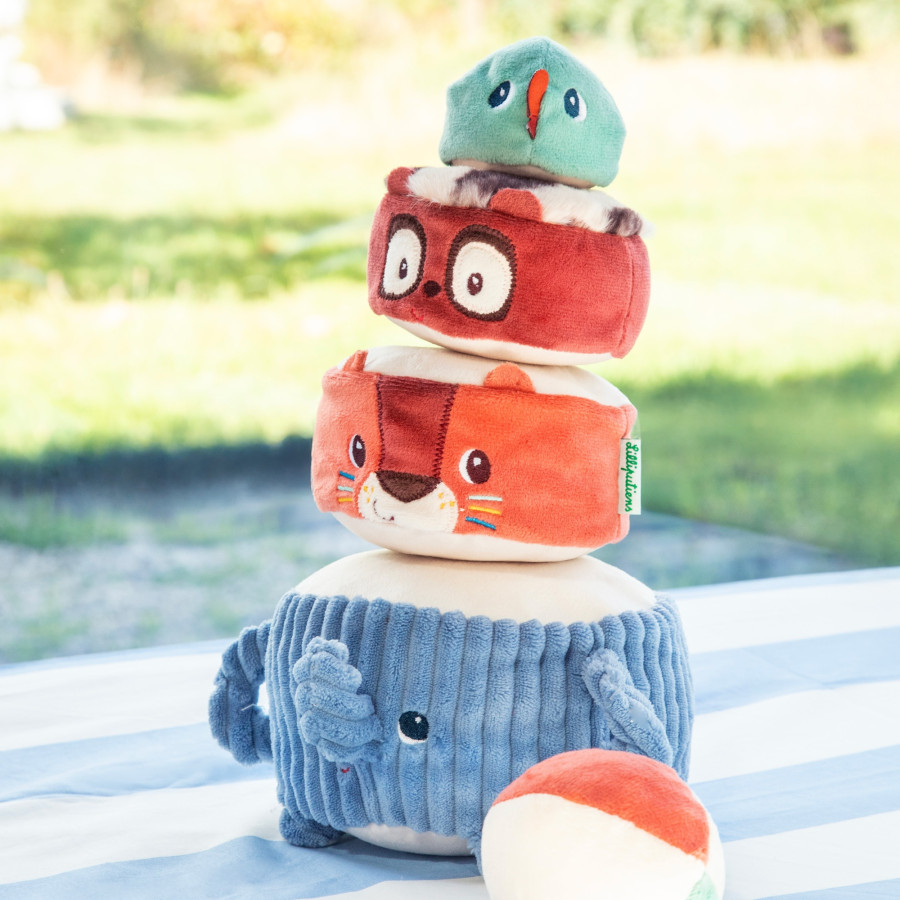 Pas op voor de landing! Deze vrolijke, zachte stapelpiramide van Lilliputiens met Albert de olifant en zijn junglevrienden stimuleert spelenderwijs de zintuigen, fijne motoriek en hand-oogcoördinatie. Met verschillende texturen, leuke geluidjes en stapelplezier is dit educatieve speelgoed perfect voor nieuwsgierige dreumesen. Wasbaar, veilig en ideaal voor eindeloos fantasierijk spelen.