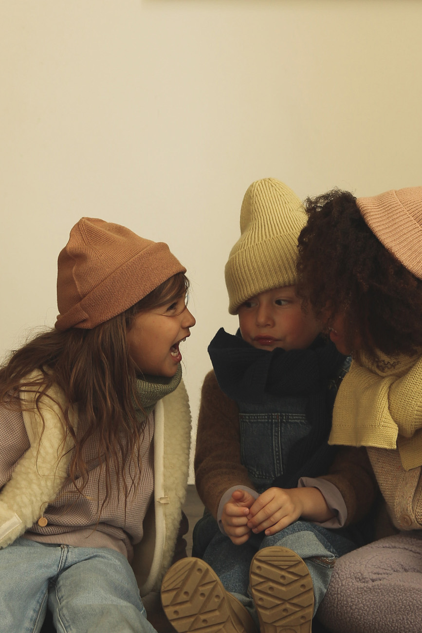 De muts is gebreid in een zachte jerseysteek en gemaakt van 100% extra fijne Italiaanse merinowol (Oeko-Tex gecertificeerd & mulesingvrij). Merinowol is temperatuurregulerend, ademend en antibacterieel, waardoor deze beanie ideaal is voor kinderen met een gevoelige huid of eczeem — zonder jeuk.