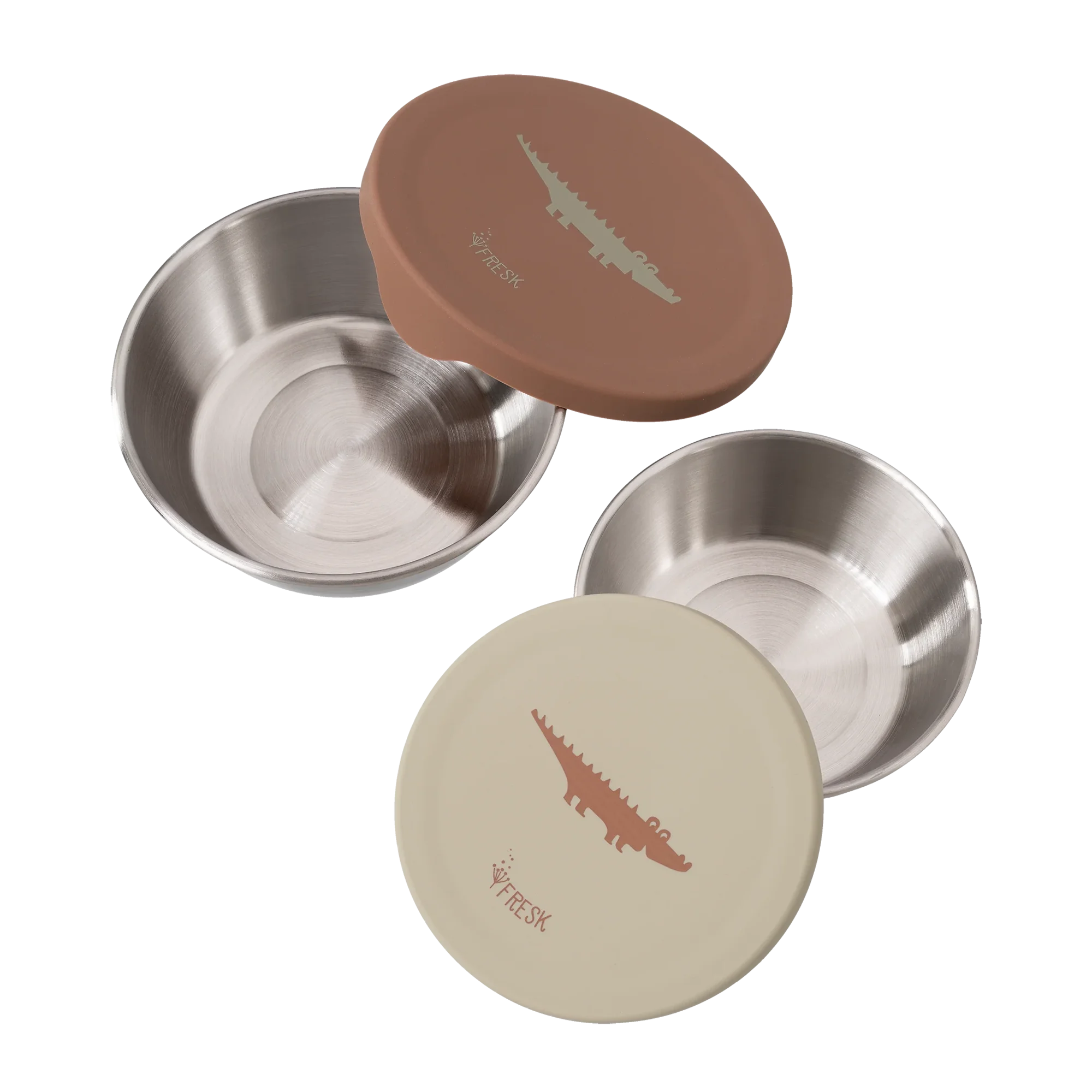 De twee bakjes zijn gemaakt van stevig roestvrij staal en hebben een handige siliconen deksel. De stalen bodem zorgt ervoor dat er geen kleur of geur van de inhoud wordt opgenomen en de flexibele siliconen deksel is gemakkelijk te openen door kleine kinderhandjes.