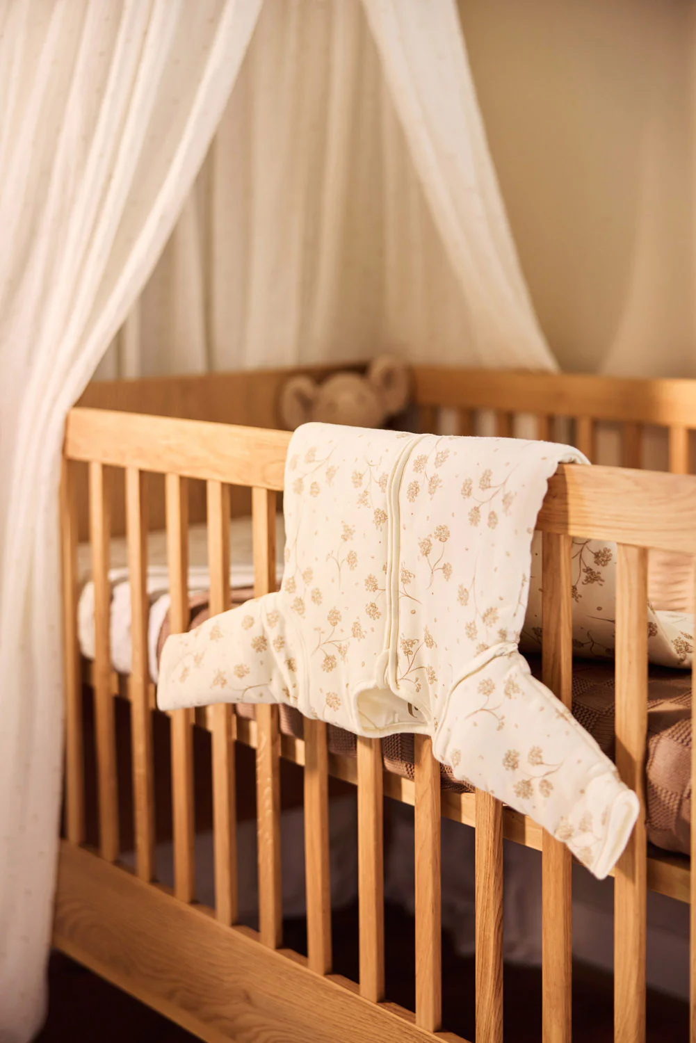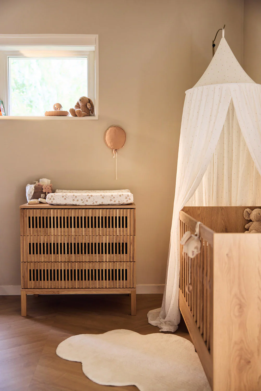 Deze klamboe in Ivory met Milky Coffee blaadjes creëert een rustgevende en gezellige sfeer in de babykamer. Het speelse crinkle effect geeft een luchtige uitstraling en past perfect binnen het Leafy Dreams thema, maar is ook mooi te combineren met andere stijlen. Ideaal om boven het bed of ledikant te hangen en direct extra sfeer toe te voegen.