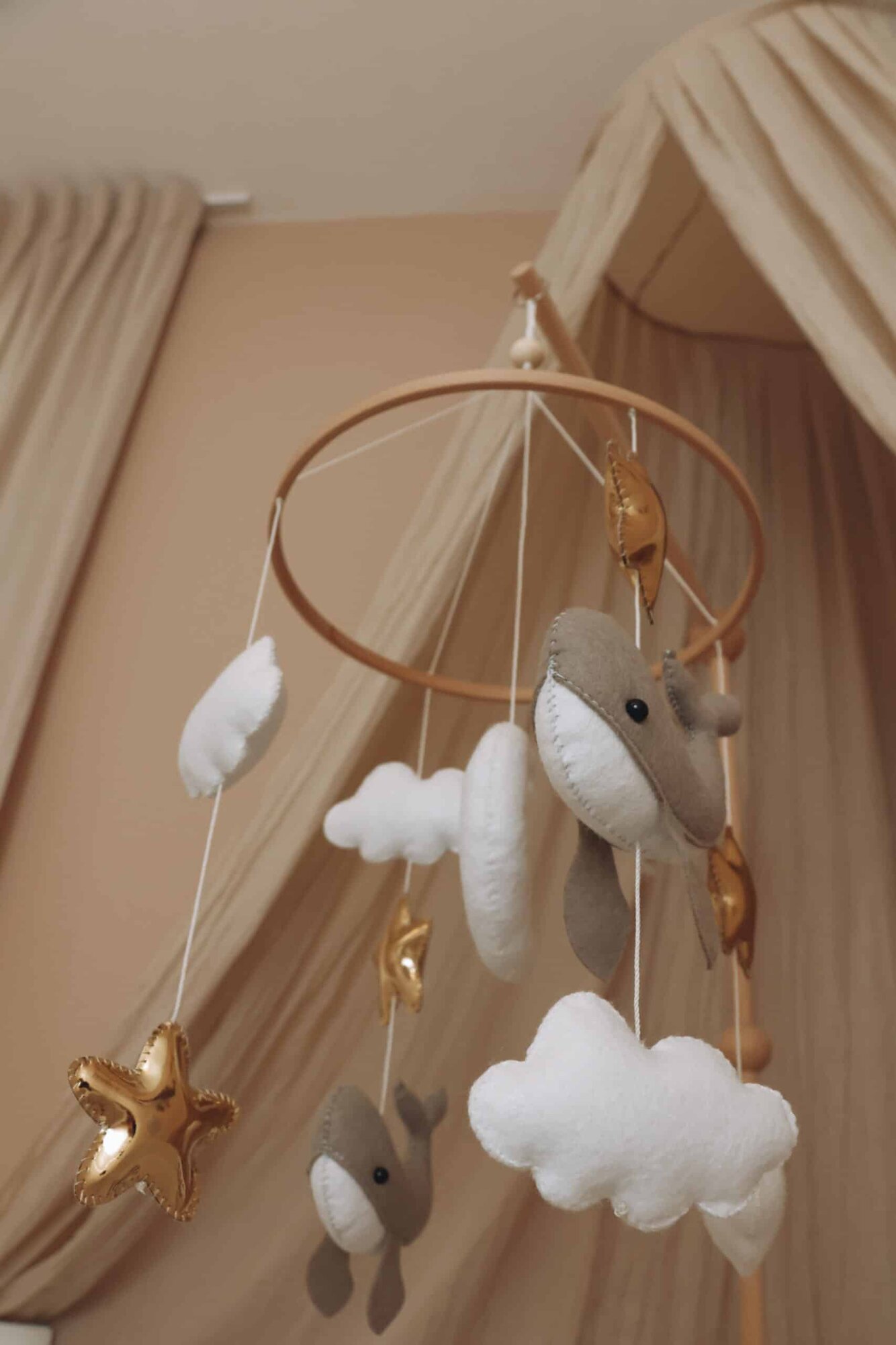 Een prachtige handgemaakte babymobiel die niet alleen helpt bij een goede nachtrust, maar ook een stijlvolle en dromerige toevoeging is aan de babykamer