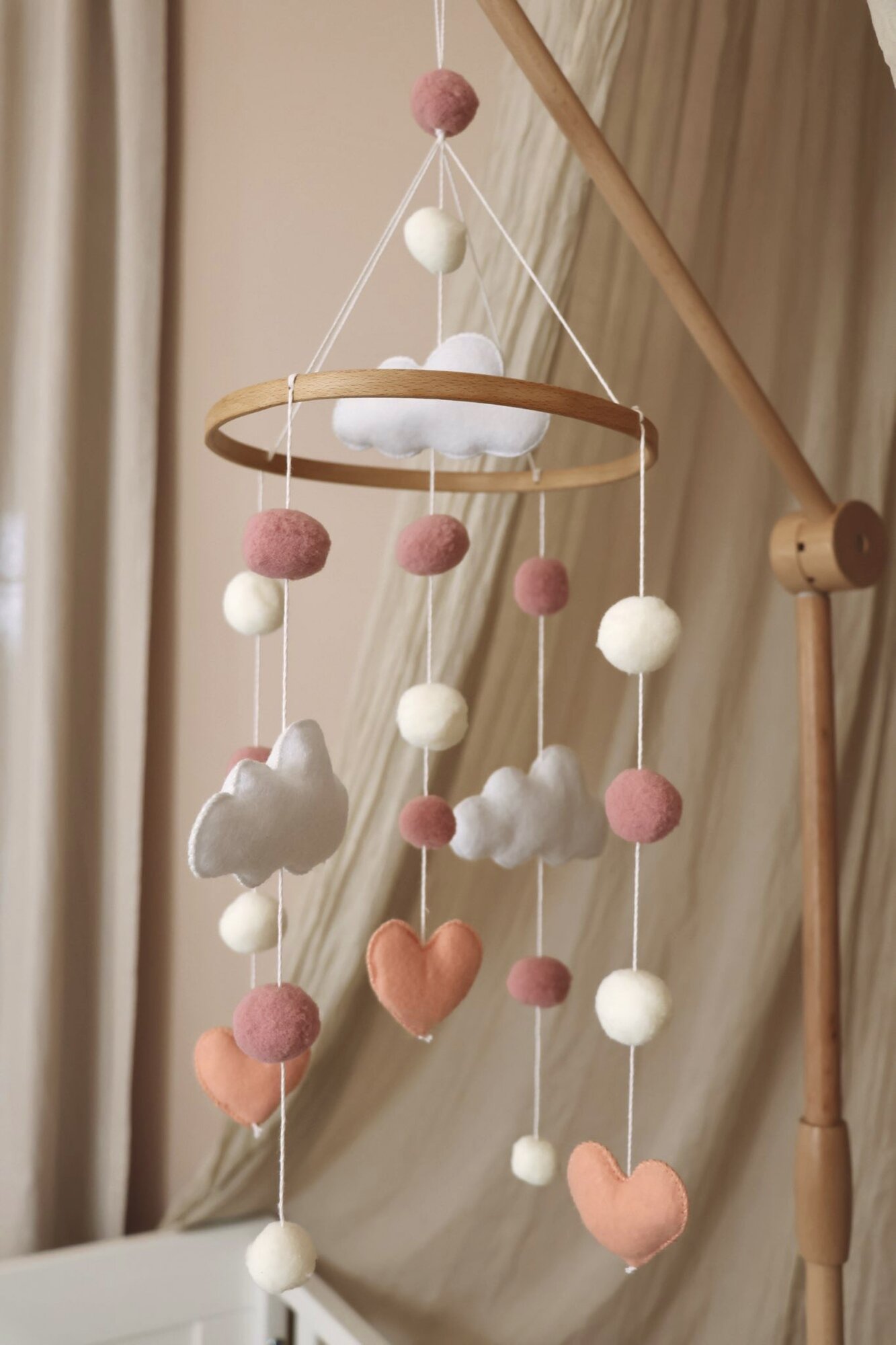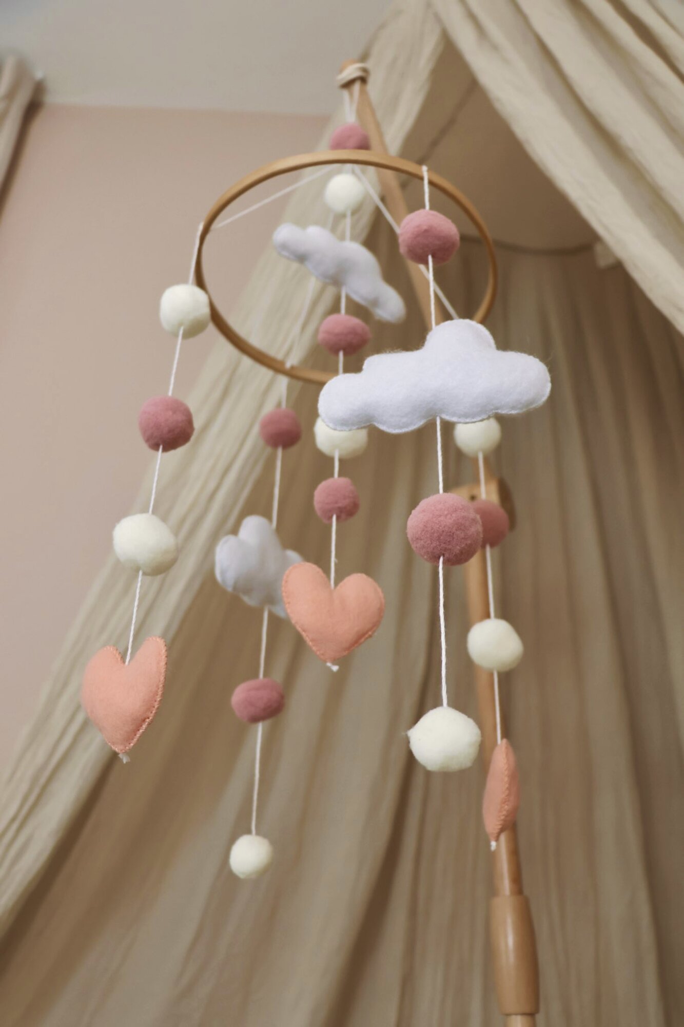 Deze schattige babymobiel van Little Loua brengt rust en zachtheid in de babykamer. De houten ring is versierd met zachte wolkjes, sierlijke pompons en lieve kleine hartjes die rustig meebewegen boven het bedje.
